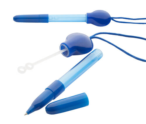 Plastové kuličkové pero se šňúrkou na krk a bublifukem. Dodávano bez tekuté náplně.