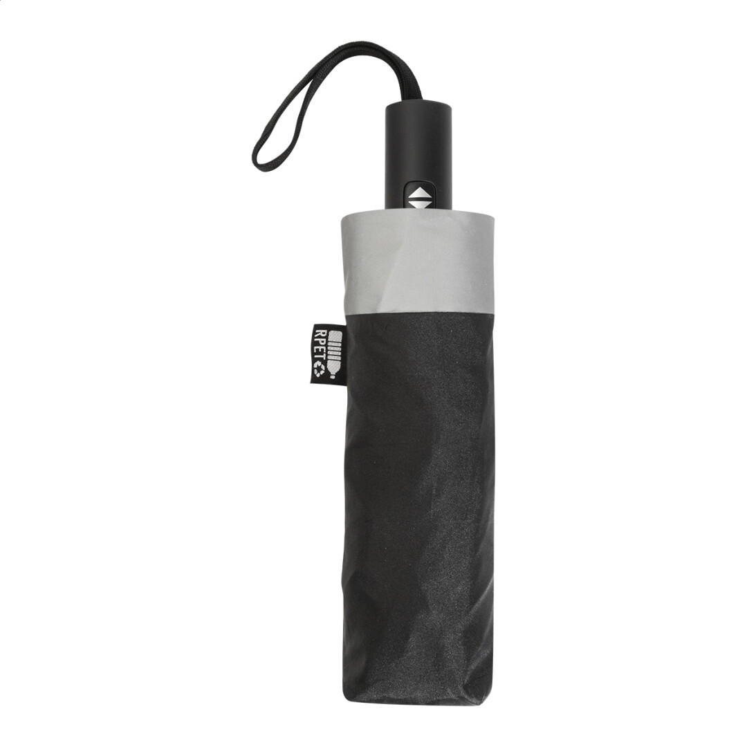 Veľký, plne automatický (otvoriť/zavrieť) vetruodolný skladací dáždnik so 4 panelmi z 190T RPET pongee a 4 panelmi z reflexnej tkaniny. S kovovým rámom, rebrami zo sklených vlákien a pogumovanou rukoväťou s pútkom na ruku. 190T RPET pongee. S charakteristickým štítkom RPET. New. Go Green. Dáždnikové panely: 4 panel. Mechanizmus dáždnika: Automatické (otváranie a zatváranie). Dáždnik - odolný proti vetru: Áno