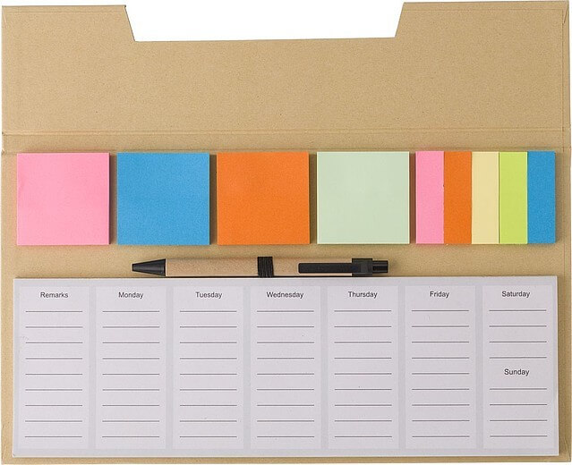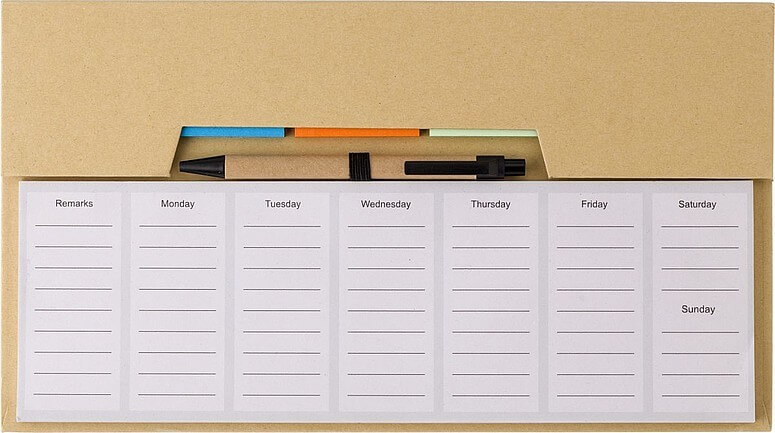 Sada značkovacích a poznámkových lístků a kuličkového pera z kartonu a plastu. Lístků je v každé barvě 50. Prvních 5 poznámkových listů je předtištěno týdenním plánovačem, ostatní jsou čistě bílé. Doporučená technologie tisku: tampontisk T2. Maximální velikost tisku: 50 x 50 mm. Rozměry: 31,1 × 17,2 × 1,3 cm. Kartonové množství v ks: 60.