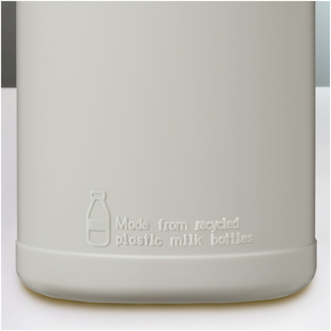 Tato jednostěnná sportovní láhev přeměňuje plastové láhve na mléko na jedno použití v něco, co lze používat znovu a znovu. Láhev se vyznačuje víčkem odolným proti vylití s odklápěcím uzávěrem a objemem 500 ml. Vzhledem k povaze recyklovaného plastu se barevné odstíny mohou mírně lišit a mohou se na nich vyskytovat barevné skvrny. Vyrobeno ve Spojeném království.