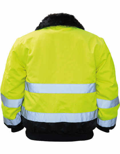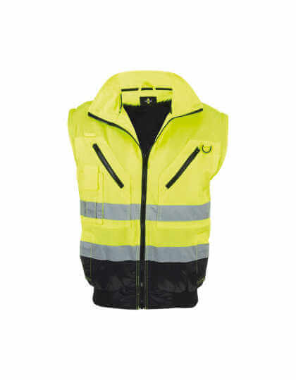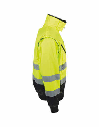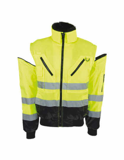 Prémiová bunda bomber Korntex® 4 v 1 | Certifikace podle normy EN ISO 20471 třída 3 | Může se pochlubit pohodlnou polyesterovou podšívkou | Vnější vrstva ze směsi bavlny a polyesteru | Manžety | Lze prát na 40 °C | Dvě náprsní kapsy, velká kapsa na smartphone, dvě bederní kapsy, kapsa na rukávu, vnitřní boční kapsa | Límec a rukávy lze odepnout pomocí zipu | Odnímatelná podšívka z umělé kožešiny | Verze A: Bunda bomber „vše v jednom“ s kapucí; verze B: odnímatelná kapuce s patenty u krku; verze C: Vesta s podšívkou; verze D: Lze nosit jako vestu bez podšívky | Vybaven čárovým kódem EAN