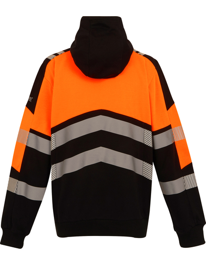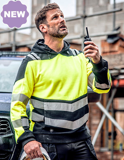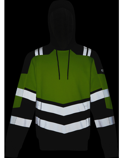 Materiál z polyesteru se zadní stranou z česané příze měkkou na dotek – 310 g /m2 | Certifikováno podle normy EN ISO 20471:2013 +A1:2016 třída 2 | Oranžová barva odpovídá také normě RIS-3279-TOM | Tepelně nanesená reflexní páska se segmentovanou páskou na hlavních dílech pro větší pohodlí | Neodnímatelná kapuce s nastavovači | Kapsa klokanka vepředu | Vyrobeno z recyklovaných materiálů.