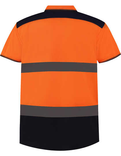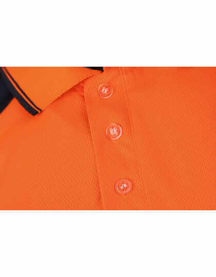 Prodyšné | Rychleschnoucí materiál | Jemná tkanina s drobným vzorem příjemná na kůži | Velká pružnost a streč, který drží tvar |Odpovídá ENISO 20471 třída 2 | Oranžová / námořnická modrá mají také certifikaci RIS-3279-TOM pro použití na železnici | Dva mimořádně široké retro reflexní pásky kolem těla | Kontrastní námořnická modrá na ramenou, límci, manžetách a lemech | Léga se 3 knoflíky | Boční rozparky se zesílenými stehy | Bez štítku | 25 max. prací cyklus