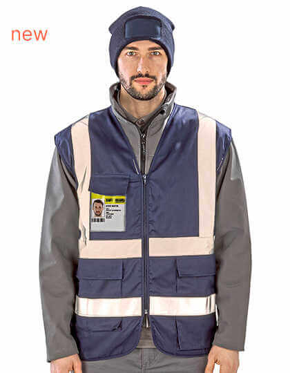 Žlutá – EN ISO 2013+A1:2016 třída 2 / UK 2019 S1696 příloha 35 nařízení 38; námořnická modrá a černá – pouze lepší viditelnost | Strategické umístění pásků na těle pro plné zdobení ramen a kapes LBP | Extra dlouhá kapsa vhodná pro ovládací zařízení | Kapsy se zavíráním na suchý zip | Lemované okraje ve sladěné barvě | Dvojitá kapsa a kapsa na průkaz totožnosti | Zapínání na zip | Velkorysá velikost | Závěsné poutko | D kroužek | Výrobce garantuje reflexní vlastnosti podle normy EN pro 25 pracích cyklů!