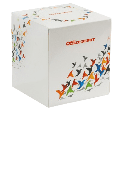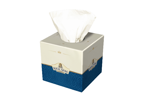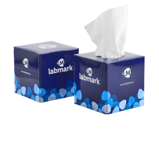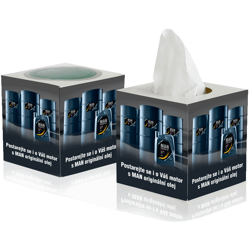 Papírová kostka s menším nebo větším množstvím kapesníků. Obsahuje 50 ks nebo 80-100 ks dvouvrstvých papírových kapesníků o velikosti 15x20,5 cm. Potisk je realizován digitálně nebo plnobarevným offsetem na celou plochu krabičky.