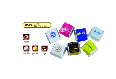 Pralinka v papírovém potištěném obalu, druhy pralinek: belgická čokoláda s originálními belgickými náplněmi.