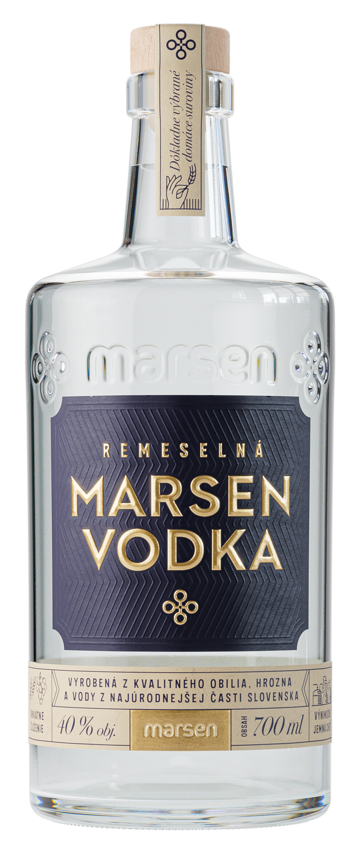 Řemeslná Vodka Marsen 40% je slovenská vodka vyráběná v malých dávkách s důrazem na kvalitu. Její výjimečně jemná chuť vzniká spojením čistého obilného lihu a unikátního hroznového lihu v přesně vyváženém poměru. Ideální na popíjení čistá, na ledě nebo jako základ prémiových míchaných nápojů. Perfektní volba pro ty, kteří hledají tradiční slovenskou vodku s moderním charakterem. Objem: 700 ml