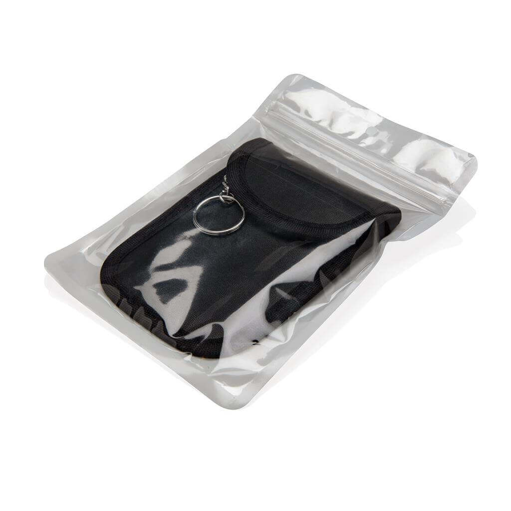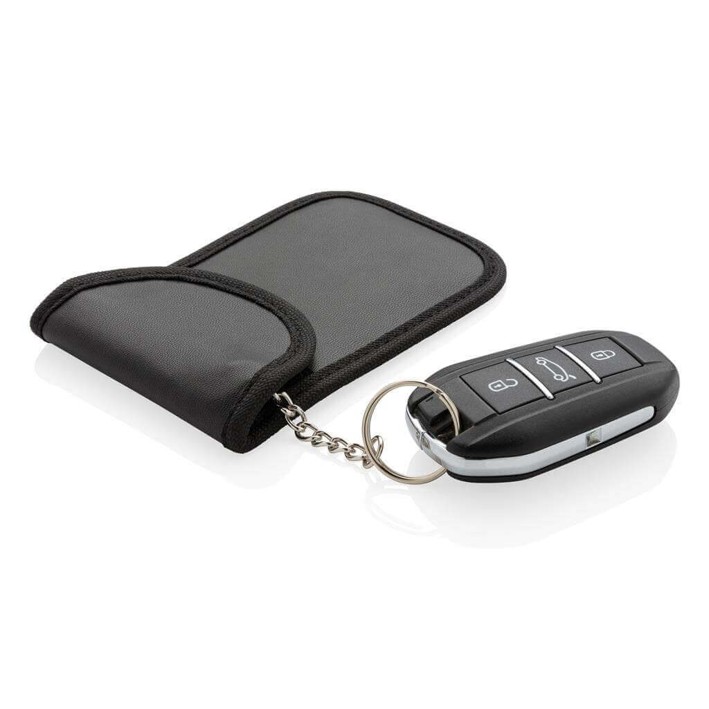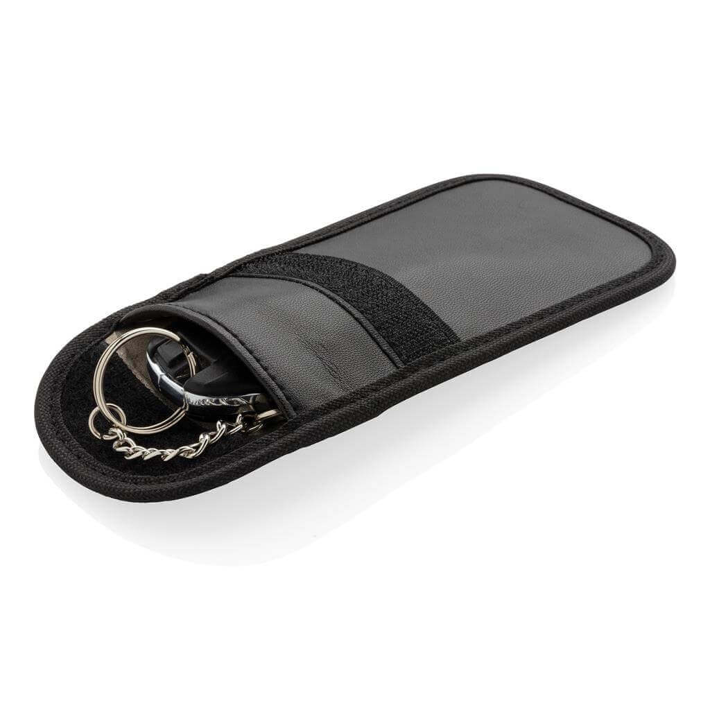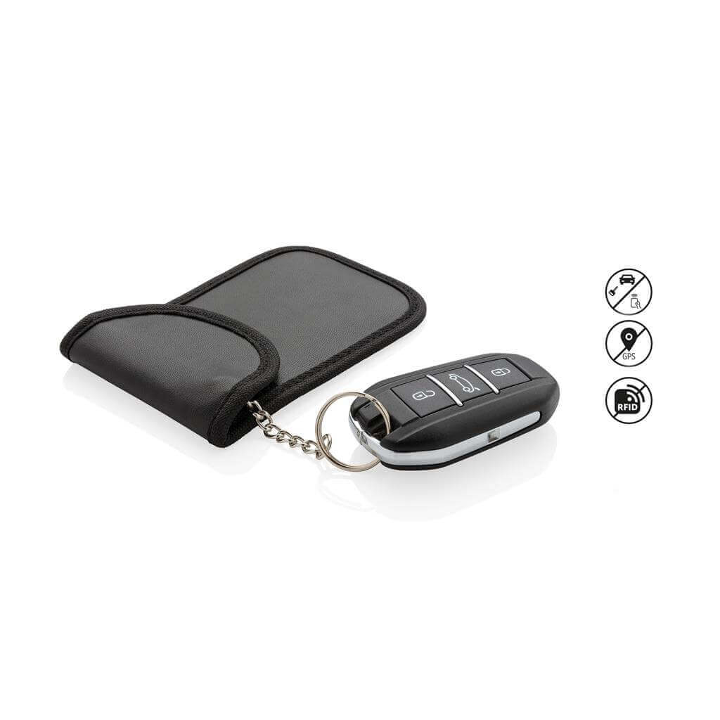 Moderní technologie přináší moderní způsoby kráděží. Jedním z nejrozšířenějších způsobů kráděží aut je dálkové zesílení signálu, který vysílá váš FOB klíč, což zlodějům umožňuje vůz nepozorovaně odemknout a odcizit. Toto RFID pouzdro vytvoří štít blokující veškeré druhy signálu, čímž tomuto typu krádeže zabraňuje. Vyrobené ze speciálního dvojvrstvého materiálu z nanovláken blokujících signál v pevném provedení. S klíčenkou. PMS color 1: Black