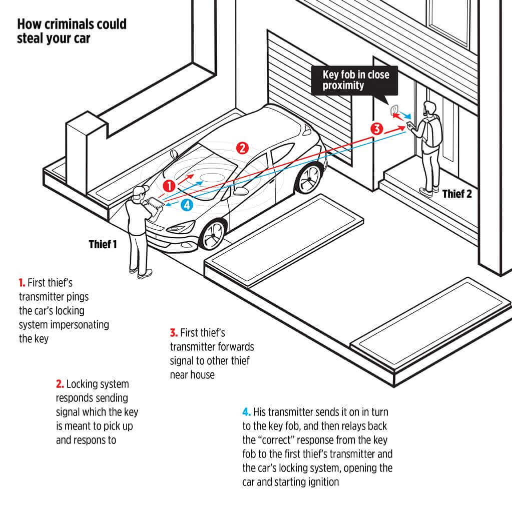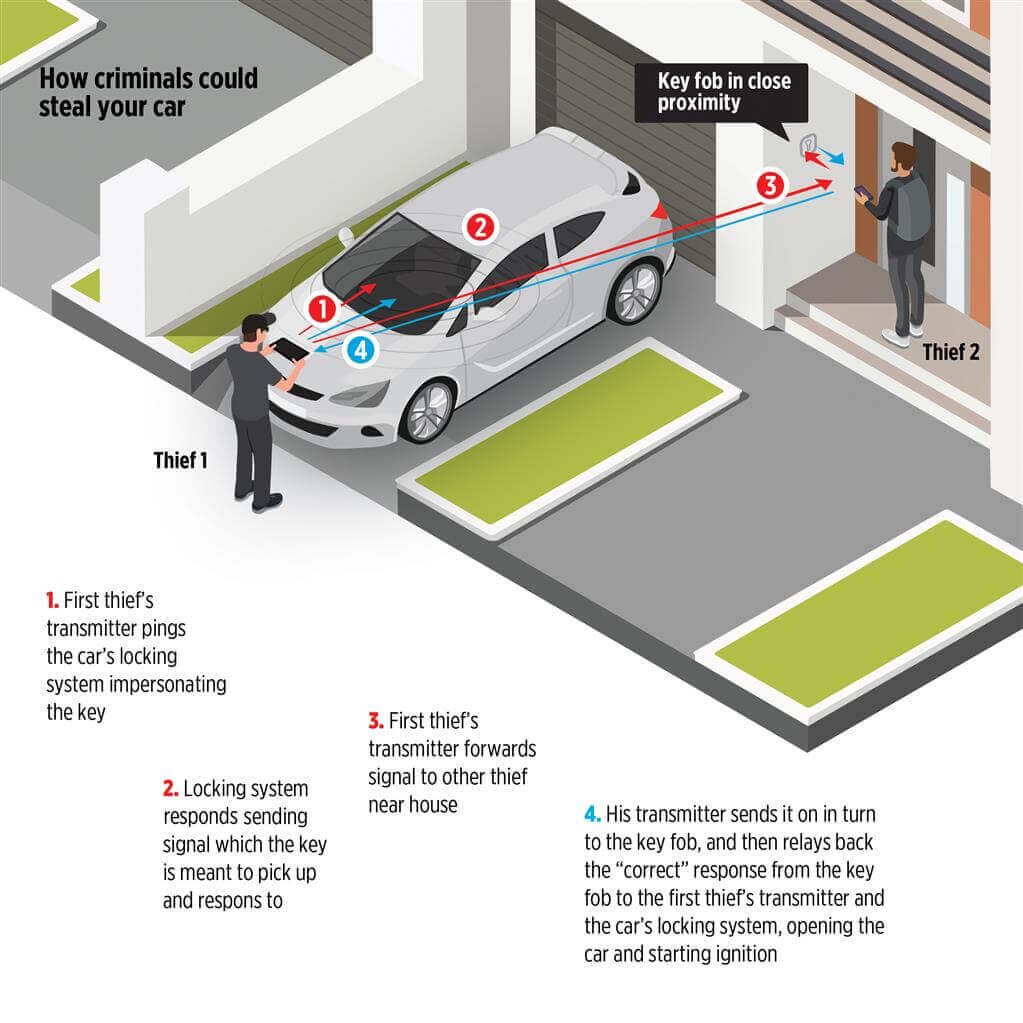 Moderní technologie přináší moderní způsoby kráděží. Jedním z nejrozšířenějších způsobů kráděží aut je dálkové zesílení signálu, který vysílá váš FOB klíč, což zlodějům umožňuje vůz nepozorovaně od