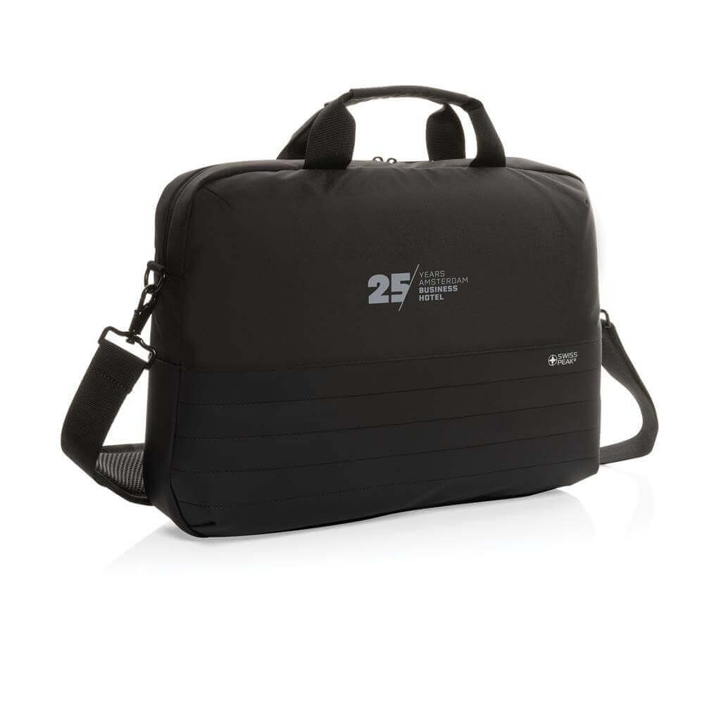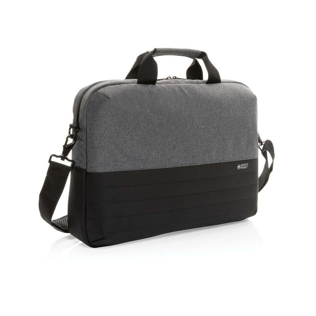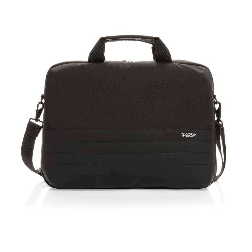 Taška Swiss Peak pro skvělou organizaci všech pracovních potřeb. Hlavní prostor na zip pro až 15,6" notebook a tablet. Množství kapes na příslušenství, RFID kapsy na peněženku a další doklady. USB port pro připojení powerbanky uvnitř a snadné nabíjení zařízení po připojení k výstupu na vnější straně. Popruh na madlo kufru na zadní straně. Vyrobeno z recyklovaného polyesteru AWARE™. Na výrobu bylo využito 20,3 500ml PET lahví a bylo uspořeno 12,1 litrů vody. Z výtěžku každého prodaného produktu z kolekce Impact je navíc přispěno 2 % na podporu iniciativy Water.org.