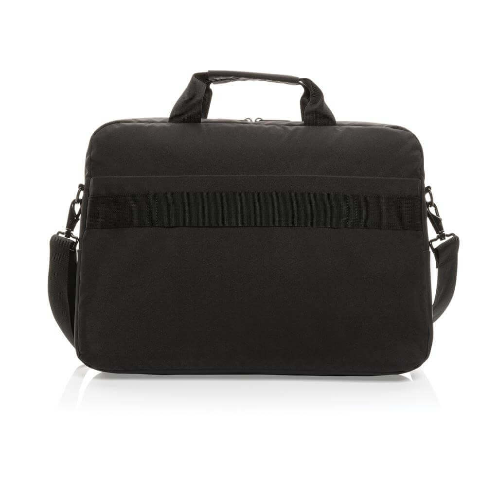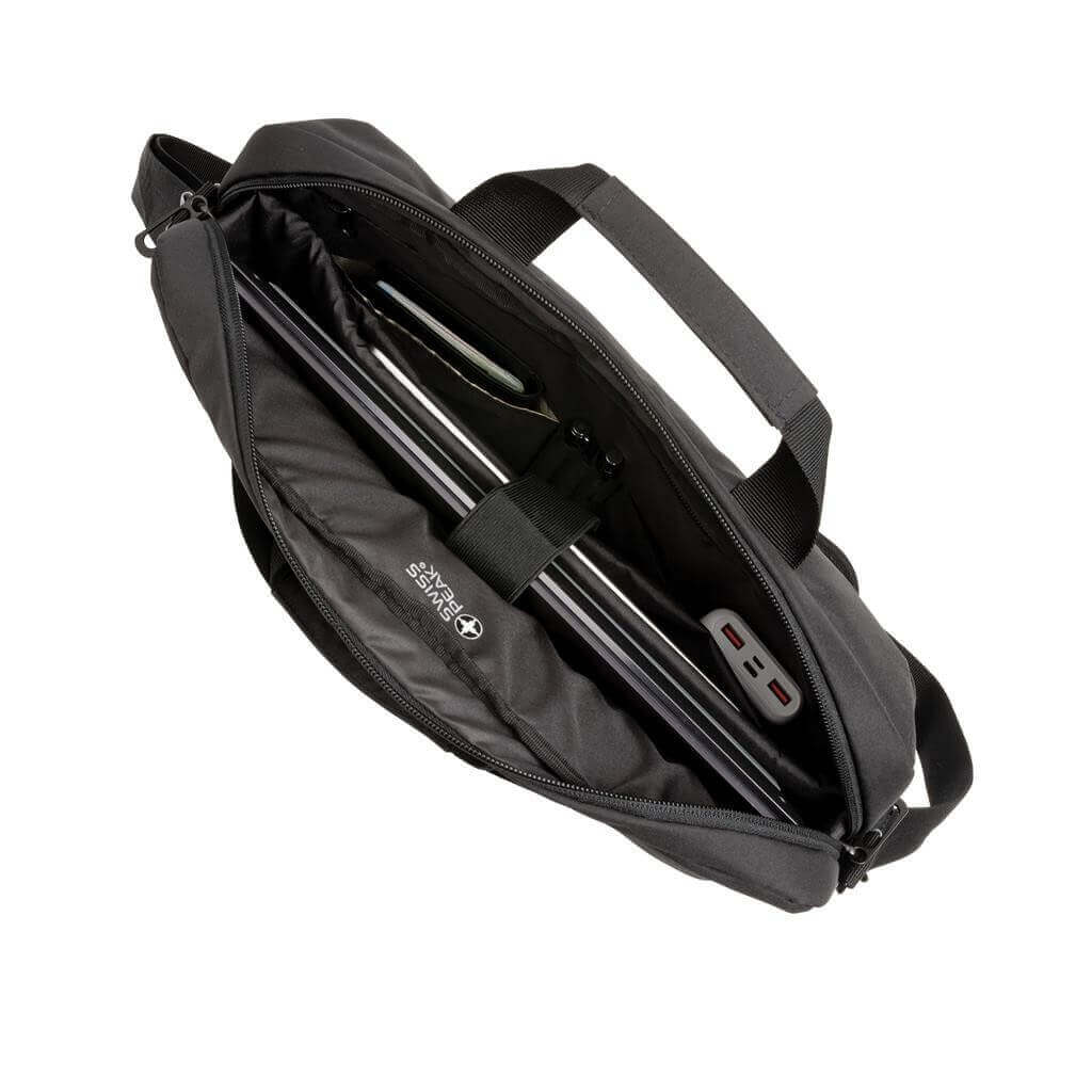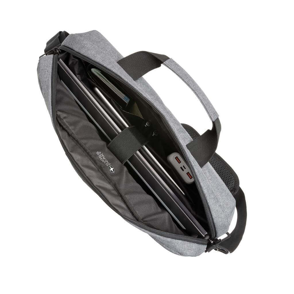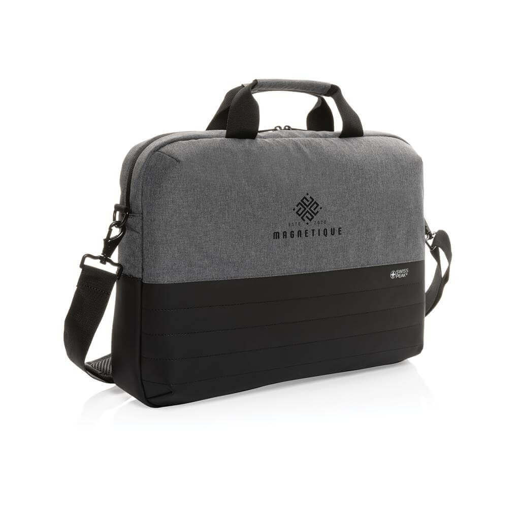 Taška Swiss Peak pro skvělou organizaci všech pracovních potřeb. Hlavní prostor na zip pro až 15,6" notebook a tablet. Množství kapes na příslušenství, RFID kapsy na peněženku a další doklady. USB port pro připojení powerbanky uvnitř a snadné nabíjení zařízení po připojení k výstupu na vnější straně. Popruh na madlo kufru na zadní straně. Vyrobeno z recyklovaného polyesteru AWARE™. Na výrobu bylo využito 20,3 500ml PET lahví a bylo uspořeno 12,1 litrů vody. Z výtěžku každého prodaného produktu z kolekce Impact je navíc přispěno 2 % na podporu iniciativy Water.org.