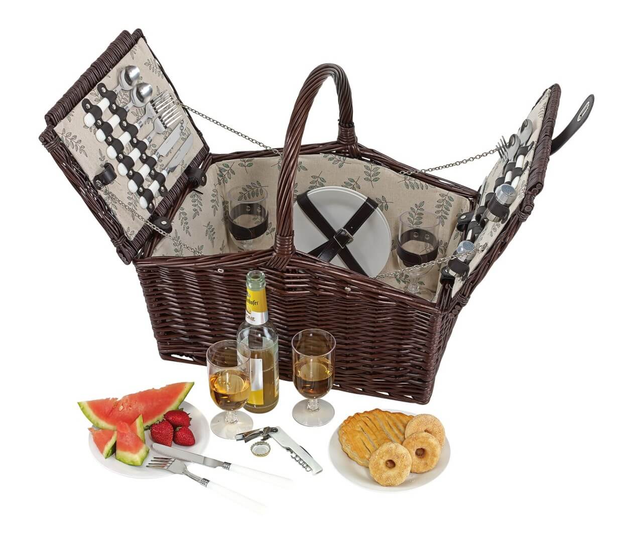 Proutěný piknikový koš "Richmond Park" pro 4 osoby: obsahuje příbory z ušlechtilé oceli s plastovou rukojetí, keramické talíře, plastové sklenice na víno, 1 nůž, slánku a pepřenku; s upínacími popruhy na vnitřní straně, podšívka vyrobena ze 100% lnu, s rukojetí a otočným zámkem na vnější straně