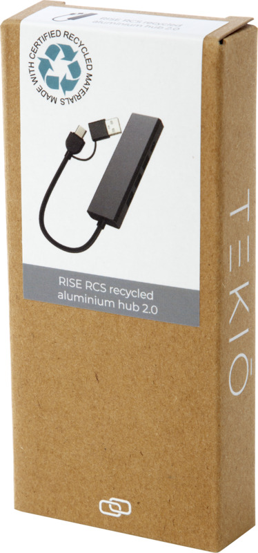 Rozbočovač USB 2.0 vyrobený z recyklovaného hliníku RCS s elegantním obdélníkovým krytem z recyklovaného hliníku. Disponuje 3x USB 2.0 porty a 1x Typ-C PD (Power Delivery) portem, který umožňuje přenášet data s přenosovou rychlostí až 480 Mbps. Přiložený vstupní adaptér Typ-C vám umožňuje používat toto zařízení s notebooky a počítači vybavenými USB-A a Typ-C. Dodáváno v prémiové krabičce ze 100% recyklovaného kraftového papíru s barevnou samolepkou.