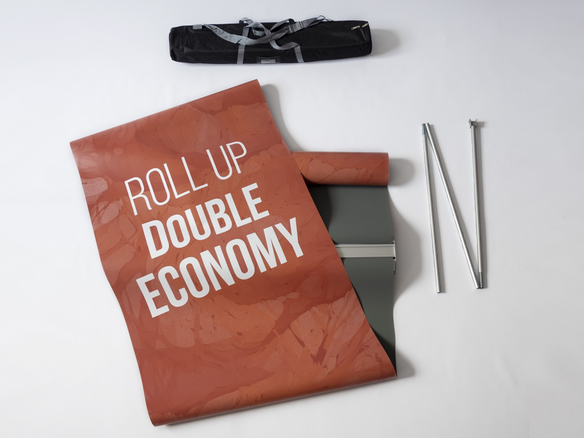 Tento ekonomický banner v roli lze použít jednostranně nebo oboustranně. Oboustranný rollup je vhodný v případě, že je k rollupu přístup z více stran. Oboustranný rollup se dodává ve stříbrném eloxovaném provedení.