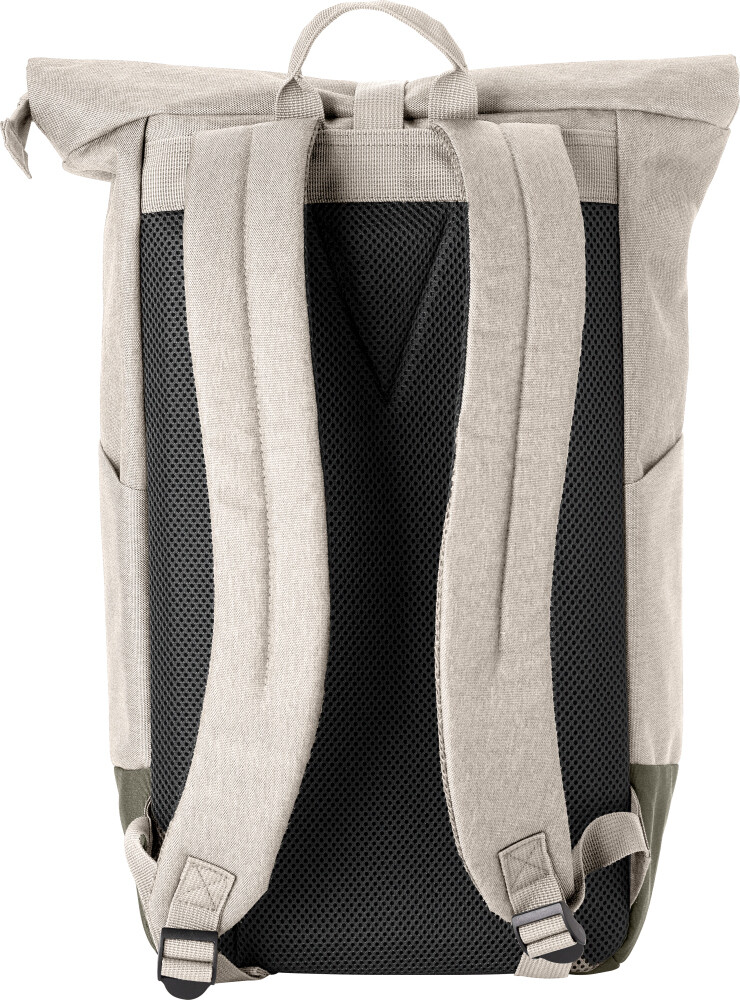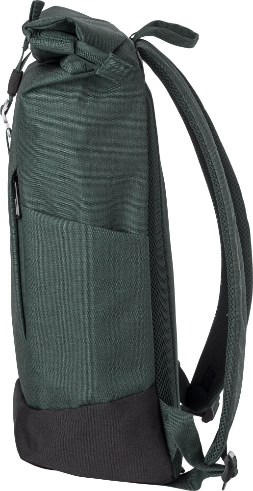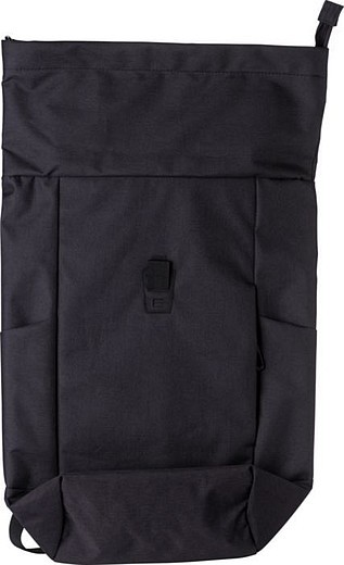 Rolovací polyesterový batoh. Jedna velká přihrádka na zip se dvěma kapsami a přihrádkou na notebook. Kapsa na zip v přední části. Polstrovaná záda a popruhy, které jsou nastavitelné. Kovový háček na uzavření. Rozměry: 25 x 14 x 45 cm.