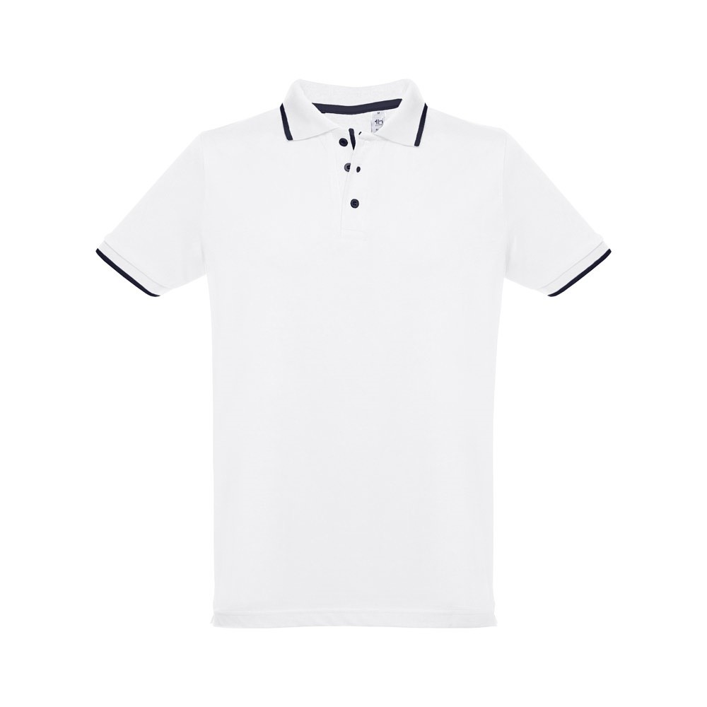 Pánská přiléhavá polokošile ze 100% bavlněného piké (195 g/m²). Krátký rukáv. Žebrovaný límec a rukávy. Dvoubarevný kontrast na límci, léze a rukávech. Vyztužená léga. Náhradní knoflík ve vnitřním švu. Přiléhavý střih s bočními rozparky.