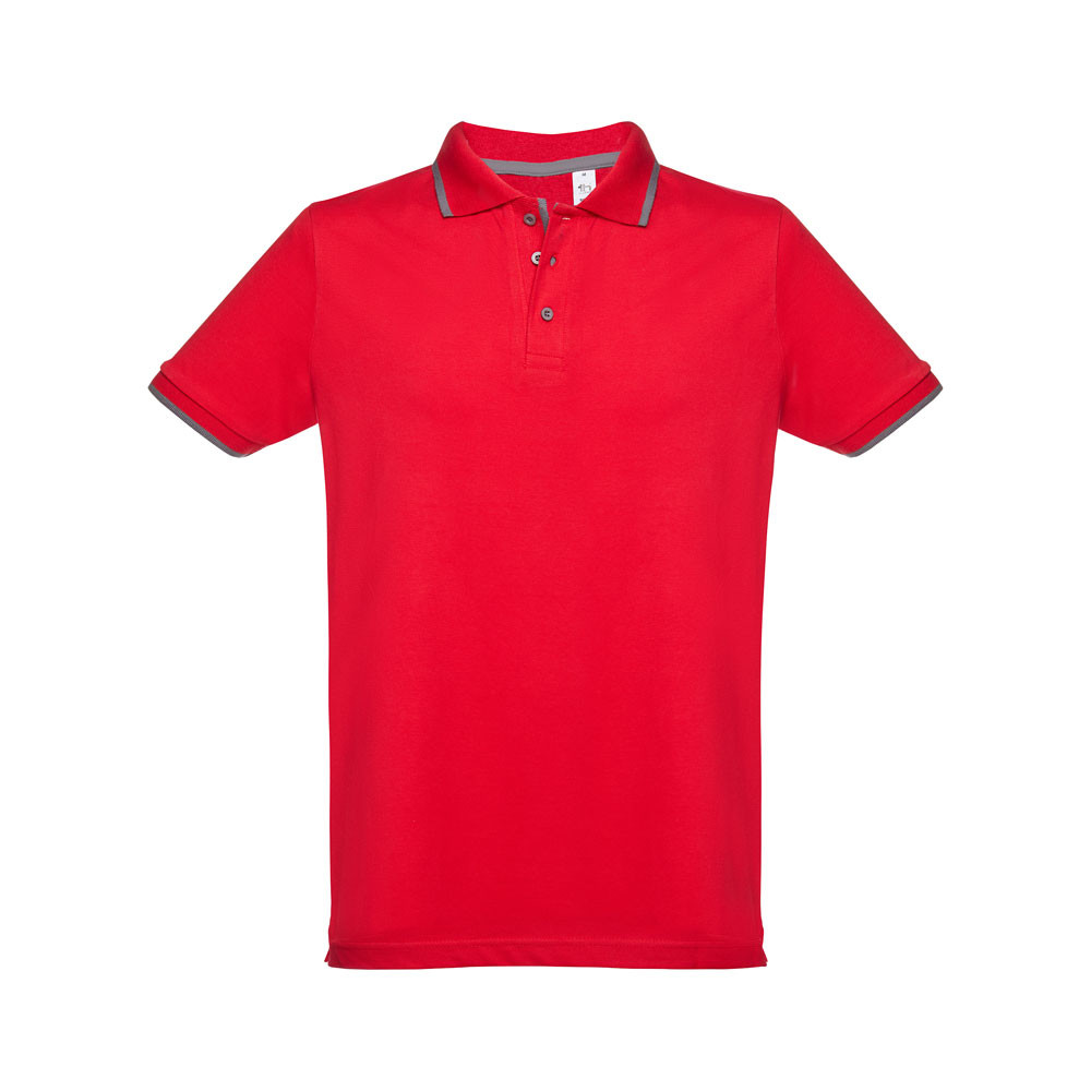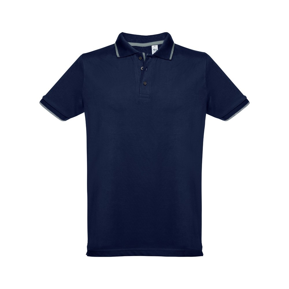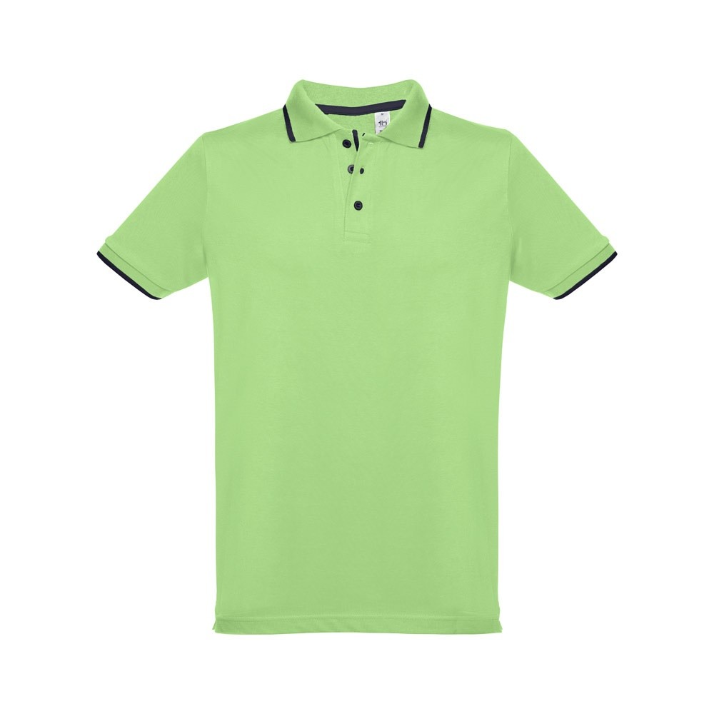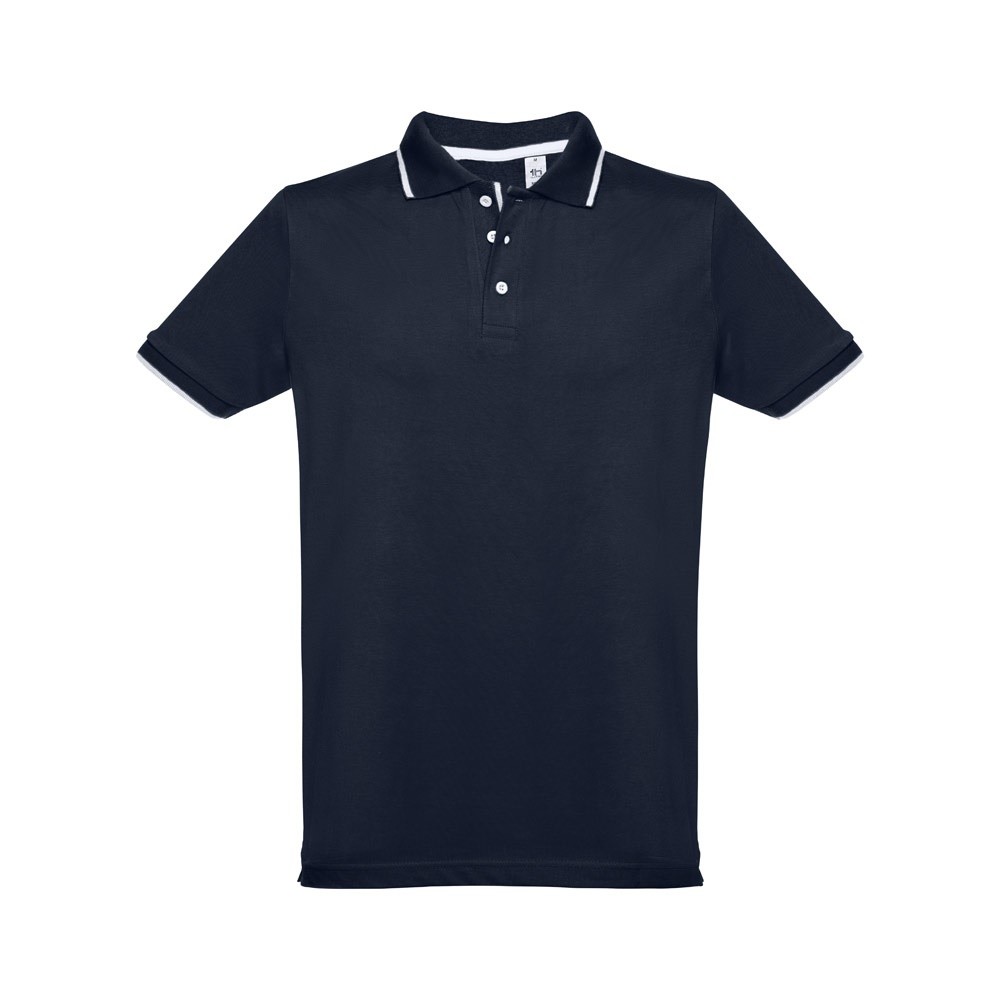 Pánská přiléhavá polokošile ze 100% bavlněného piké (195 g/m²) přiléhavého střihu s bočními rozparky. Barva 83: 85% bavlna a 15% viskóza. Krátký rukáv. Žebrovaný límec a rukávy. Dvoubarevný kontrast na límci, léze a rukávech. Vyztužená léga. Náhradní knoflík ve vnitřním švu.