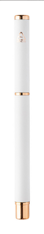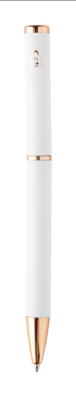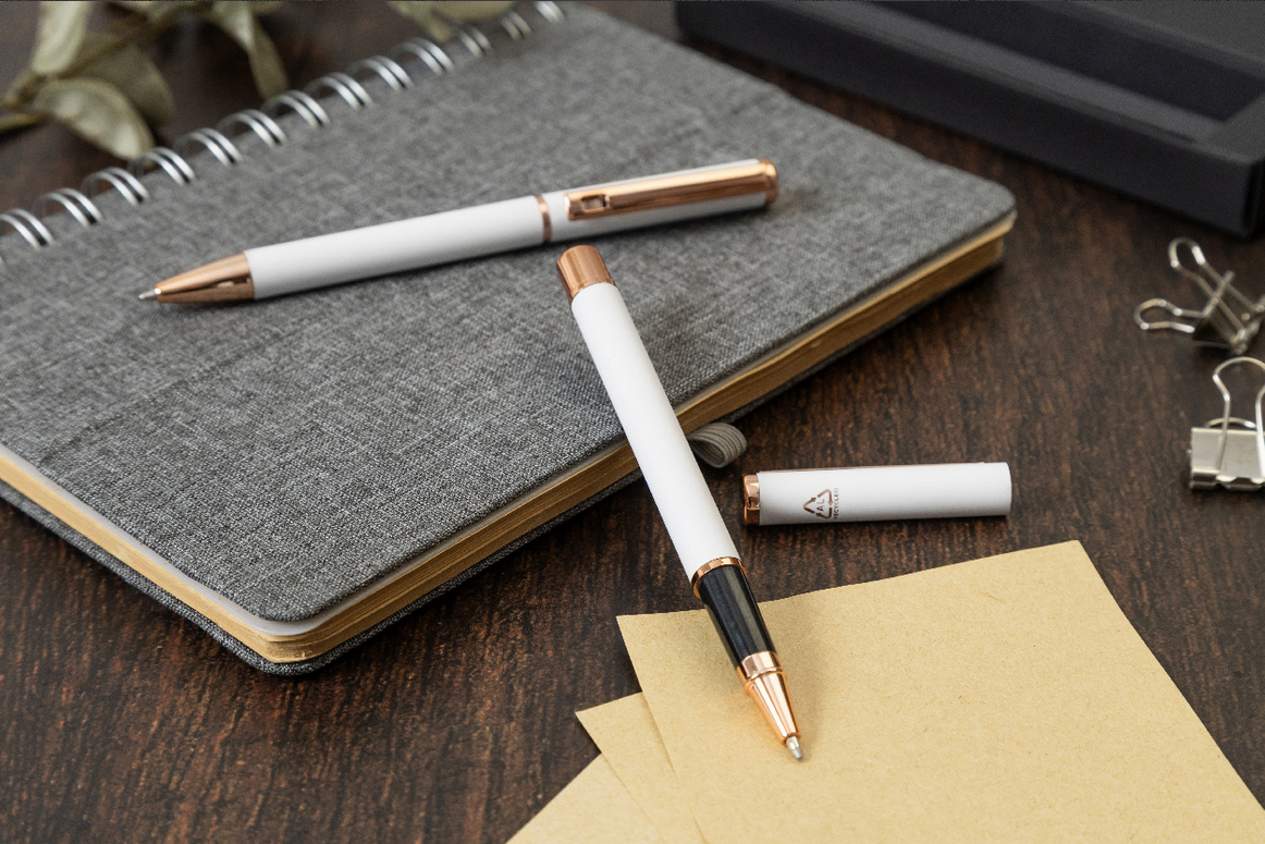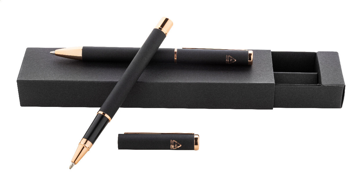 Sada per z recyklovaného hliníku s kuličkovým perem a rollerem s pogumovaným povrchem a detaily růžového zlata. S modrou náplní. Se speciálním povrchem pro zrcadlové laserové gravírování v růžovo-zlaté barvě. V černé papírové dárkové krabičce.