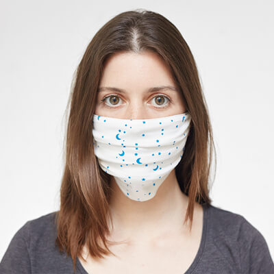 Polyesterová rouška na obličej, 2 vrstvá na zakázku. Roušku lze potlačit plnobarevnou sublimací, celoplošně. S bílým nebo černým elastickým lemováním a úchyty za uši.
