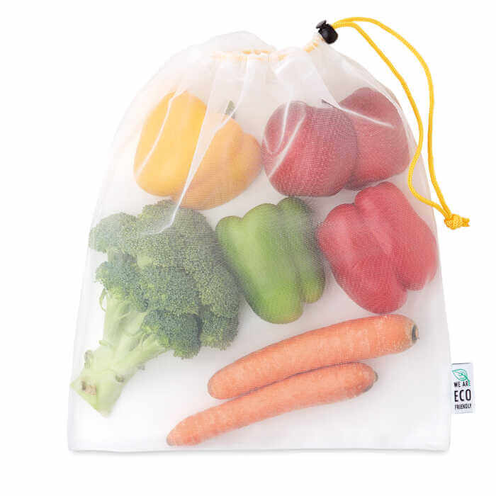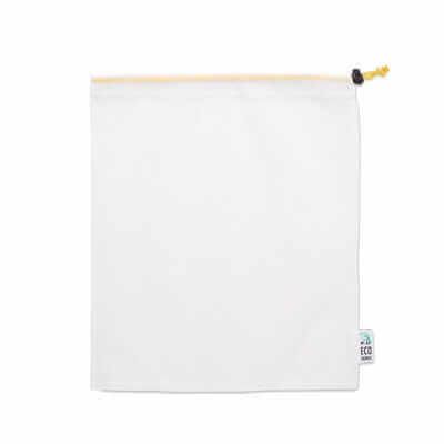 Síťkovaný sáček na potraviny na míru pro čerstvé potraviny ze síťoviny RPET (certifikovaný pro styk s potravinami, FCA), s černým nebo bílým zavíráním z ABS a barevnou polyesterovou šňůrkou. Sáček lze plnobarevně a celoplošně potisknout. Hromadně zabalené (nepoužívají se žádné plasty) a volitelně každá sáček může být zabalena do papírového obalu s vlastním potištěným designem. Rozměry tašky: 30x35cm. Lze prát v pračce. V nabídce máme i jiné velikosti kapes.