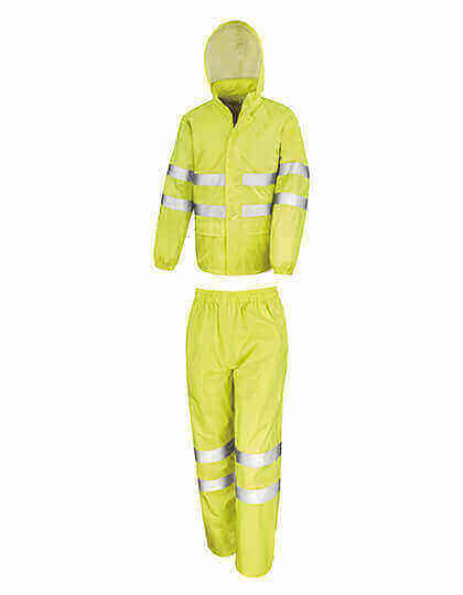 Odolný proti vetru a nepromokavý | Stormdri 2000 | Povrchová úprava PVC | Bunda: lem na ochranu proti vetru s patentkou | Skrytý, robustní zip | Lem s prestavitelnou stahovací šnurkou | Integrovaná kapuce se stahovací šnurkou | Bocní prední kapsy se záklopkou | Elastické rukávové pásky | Zatavené švy | Poutko | Sítová podšívka na zádech pro lepší vetrání | Reflexní bezpecnostní pásy | Kalhoty: bocní šikmé kapsy | Elastický pás | Reflexní pás