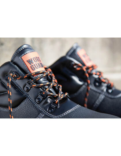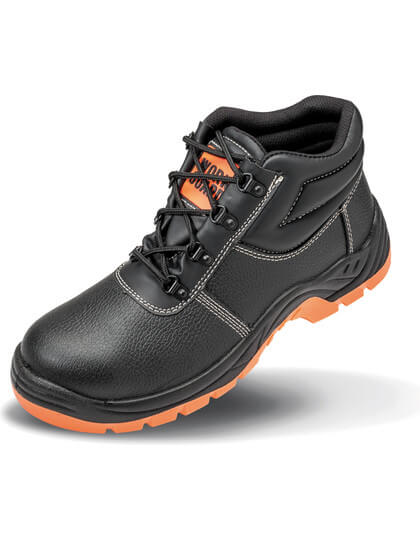 Bezpečnostní obuv kategorie SBP | Ocelová tužinka a mezipodešev | Cerná ocka s leskem | Tkanicky: All Orange, krabice obsahuje i rezervní sady v barvách Orange/Black a All Black | Svršek: svršek z cerné embosované štípané kuže | Vnitrek kotníku: vnitrní podšívka, cerná sítovina | Špicka: cerný materiál EVA | Podrážka: polyuretan s dvojnásobnou tuhostí v barve Black/Orange | Límec svršku: cerný vypolstrovaný | splnuje EN 20345:2011 SBP