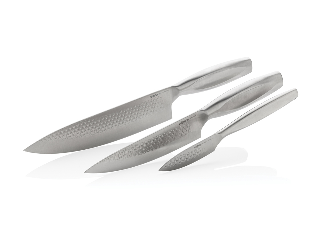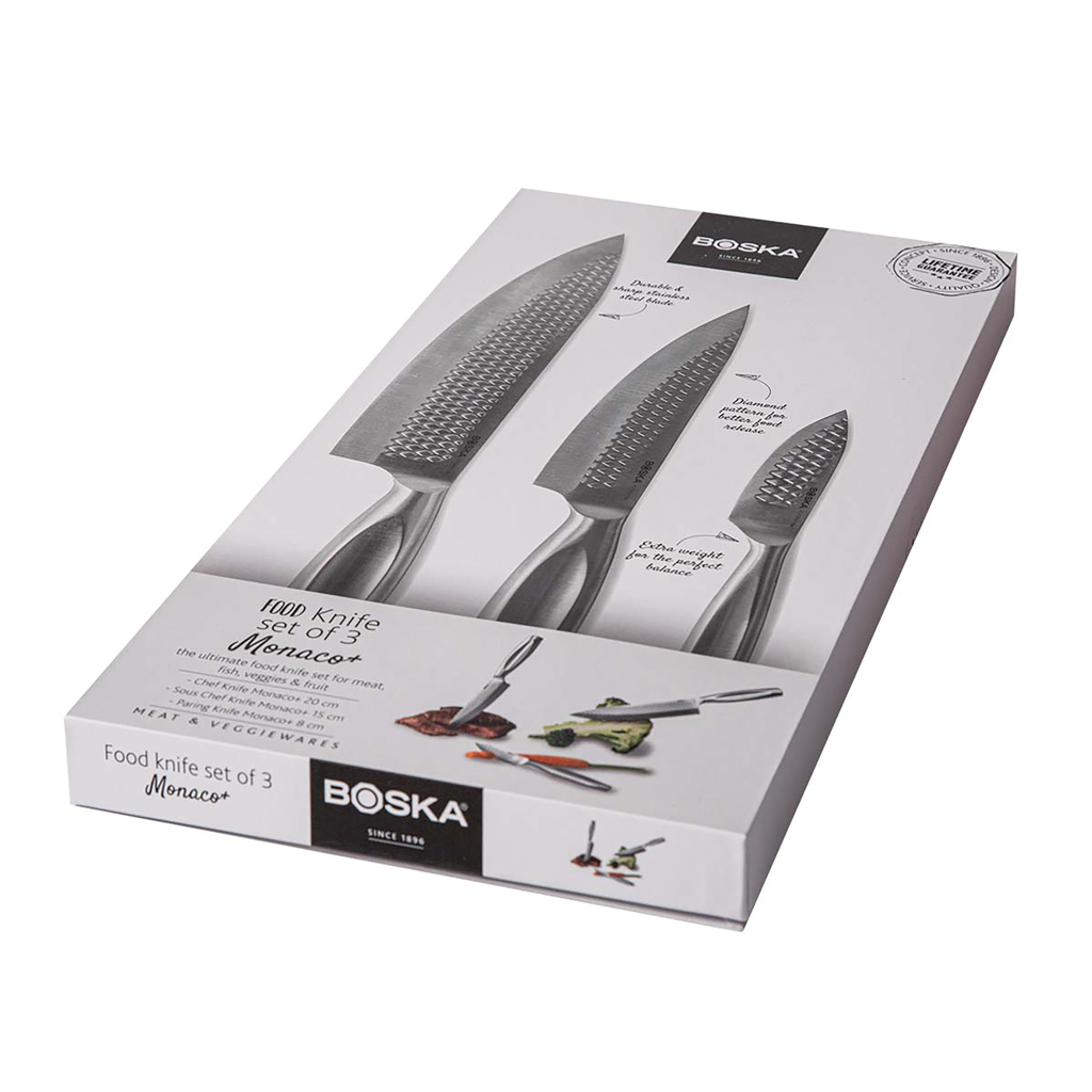 Sada tří kuchyňských nožů BOSKA Monaco+ obsahuje nože profesionální kvality z nerezové oceli s tenkými rukojeťmi - kuchařský nůž na všechno, nůž Sous Chef a loupací nůž na zeleninu a ovoce. Nože jsou mimořádně ostré a lze je mýt pouze ručně. Na výrobek je poskytována doživotní záruka.