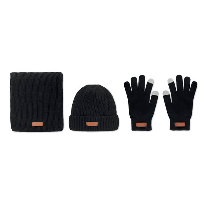 Sada 3 kusů zimních doplňků. Obsahuje čepici, šálu a hmatové rukavice se štítkem pro potisk. Vyrobeno z RPET. S těmito doplňky na zimu si na vás chladné počasí jen tak nepřijde. Tyto předměty jsou vyrobeny z recyklovaného PET plastu a představují tak skvělou udržitelnou volbu. Kontrastní štítek na každém předmětu mu dodává stylový nádech.