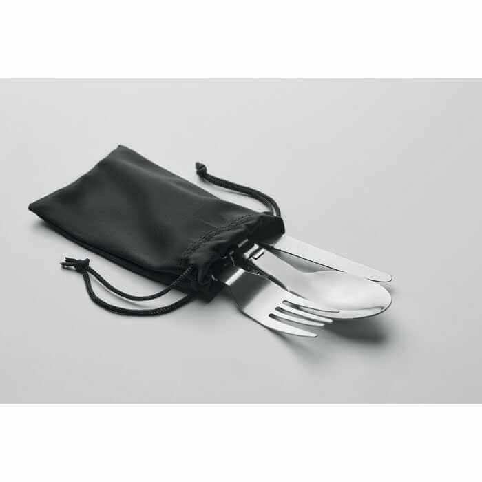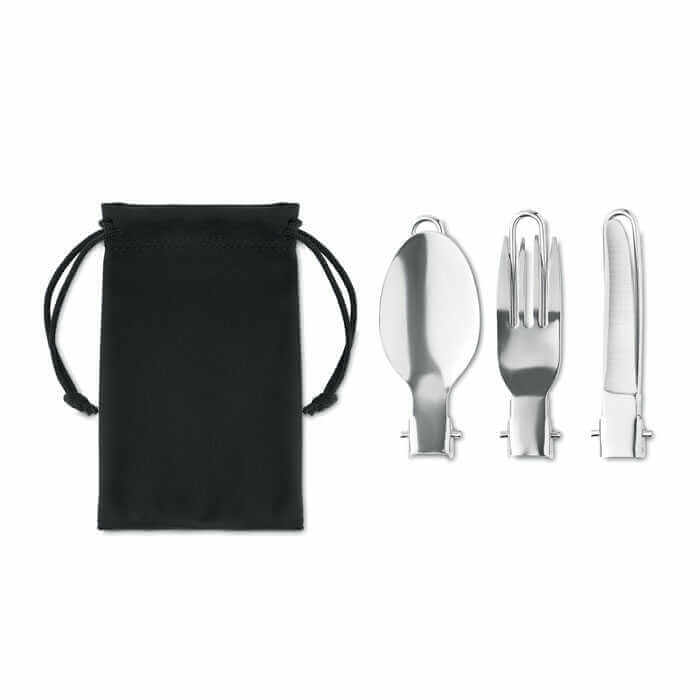 Třídílná sada kempingového náčiní z nerezové oceli v pouzdře RPET. Ideální dárek pro milovníky outdoorových aktivit, kteří rádi a pravidelně kempují. Nože, vidličku a lžíci lze složit na polovinu, aby zabíraly co nejméně místa, takže si je můžete pohodlně nosit s sebou. Pouzdro na příbory je vyrobeno z recyklovaného PET plastu.