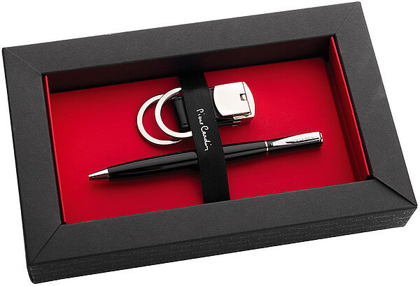 Značková sada kožené klíčenky a kovového kuličkového pera Pierre Cardin. Klíčenka z pravé kůže obsahuje dva kroužky na přichycení, které od sebe lze oddělit a vytvořit tak dvě klíčenky. Kuličkové pero je navrženo v elegantně hladkém designu a upoutá svým atypickým tvarem, díky kterému se velmi pohodlně používá. Obsahuje kvalitní náplň v modré barvě s hrotem 1 mm. Baleno v luxusní krabičce Pierre Cardin, dodáváno s certifikátem pravosti. Rozměry: klíčenka 3,3 × 6,9 × 1,5 cm, kuličkové pero 1,2 × 13,7 cm, balení 21, 4 × 13,4 × 3,5 cm.
