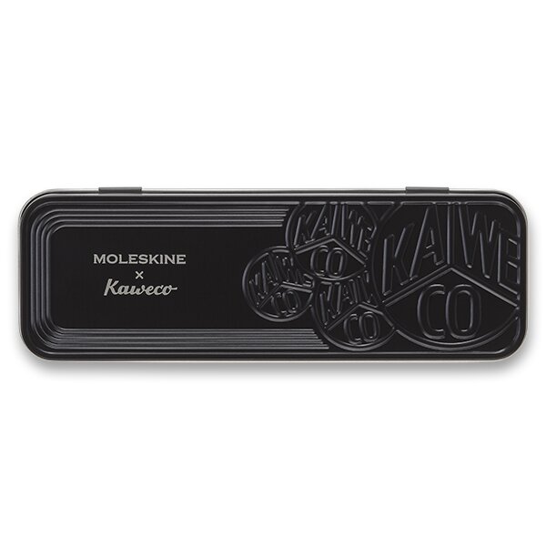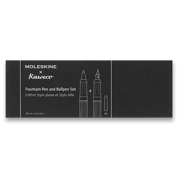 Souprava kuličkové pero a plnicí pero Moleskine Kaweco a 6 ks modrých bombiček. Tělo je z ABS plastu s ergonomickým úchopem do tvaru trojhranu pro pohodlné psaní. Kuličkové pero i pero mají vysoce kvalitní hrot. Dodáváno v kovové krabičce s papírovým přebalem v barvě kuličkového pera.