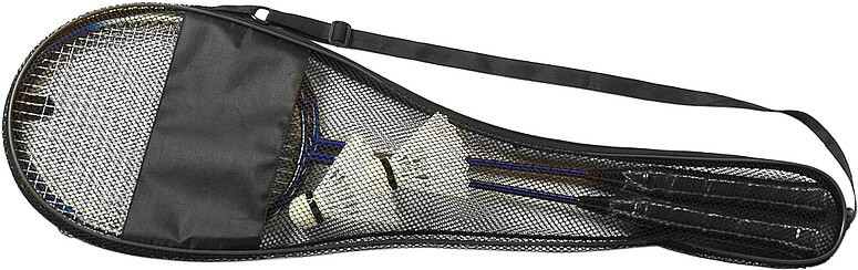 Kovový bedmintonový set skládající se ze dvou raket s ocelovými rámy a plastovými držadly, dvou raketoplánů a černého síťového pouzdra s ramenním popruhem.