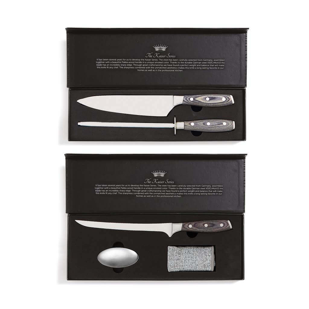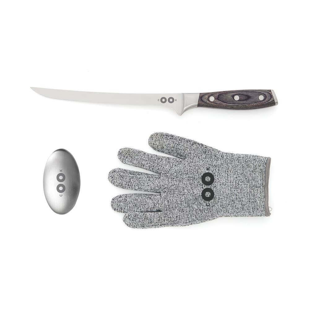 Sada na filetování ryb obsahující filetovací nůž, rukavici z ocelové síťoviny a kovové mýdlo. Rukavice umožňuje lepší uchopení ryby a zároveň chrání před případnou nehodou. Kovové mýdlo odstraňuje pachy, například od ryb a cibule. Nůž je vyroben z německé oceli X50CrMoV15 s rukojetí ze dřeva pakka. Díky snadno uchopitelné rukojeti a vynikajícímu vyvážení čepele je práce s nožem pohodlná a snadná. Velikost: 21cm čepel.