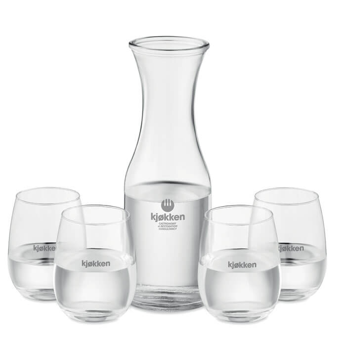 Sada na nápoje z recyklovaného skla. Karafa (1 l) s korkovým víčkem a 4 sklenice (420 ml). Podávejte čerstvé nápoje s touto stylovou sadou skleněné karafy a sklenic. Korkové víčko dodává karafě přírodní vzhled. Díky korku a recyklovanému sklu je tato sada efektní udržitelnou volbou.