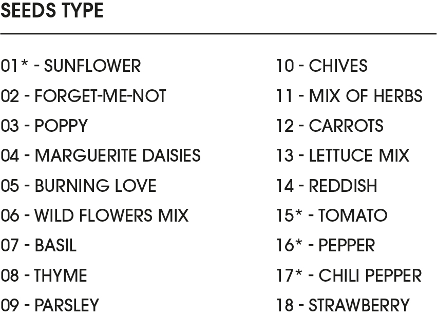 1) Vyberte si tři semena z 18 nabízených. Můžete si vybrat tytéž nebo 3 různé typy. S dodatečnými poplatky lze přidat další kapsy semen.