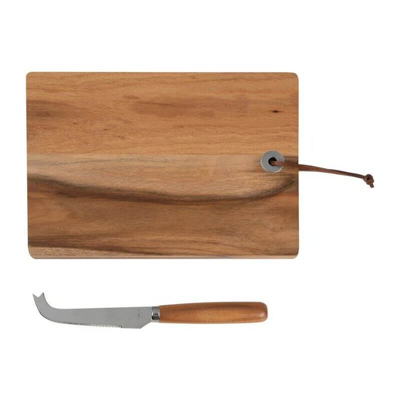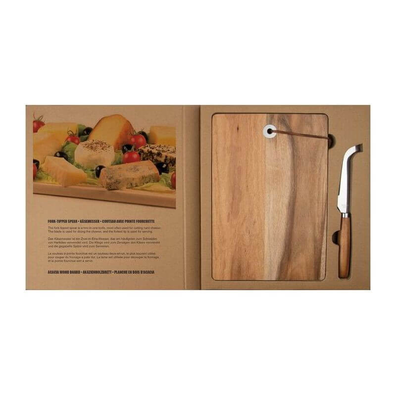 Sada na sýr v ekologickém balení sestávající z dřevěné desky s koženým poutkem na zavěšení a sýrového nože z nerezu. Způsob potisku CO2 gravírování.