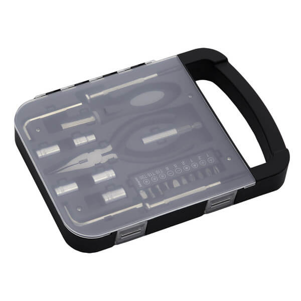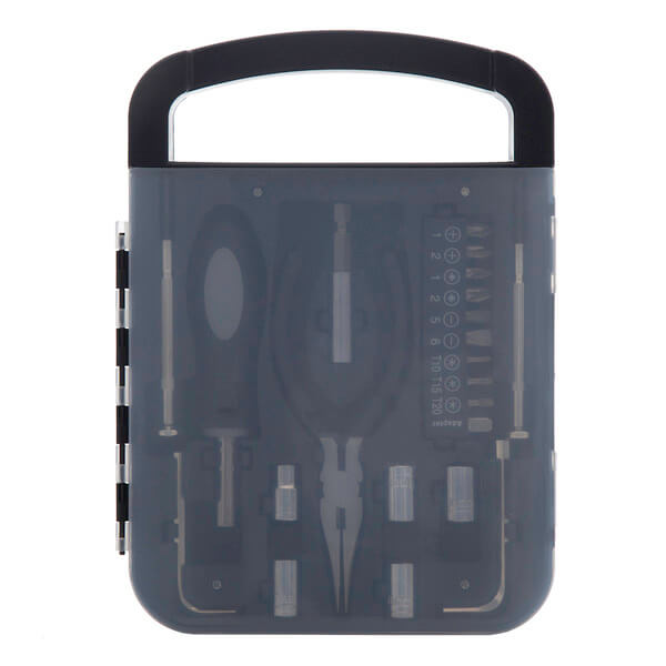 Sada nářadí z oceli a plastu s 21 funkcemi: křížový šroubovák, plochý šroubovák, adaptér (¼"), Torx klíč (růžicový) – 3 velikosti, ploché šroubováky – 2 velikosti, PZ šroubováky – 2 velikosti, křížové šroubováky – 2 velikosti, inbusový klíč – 2 velikosti, očkový klíč – 5 velikostí, kombinační kleště, univerzální magnetický držák na šroubovák (¼"), 35 mm nástavec na šroubovák (¼"). Baleno v obalu z plastu s rukojetí.