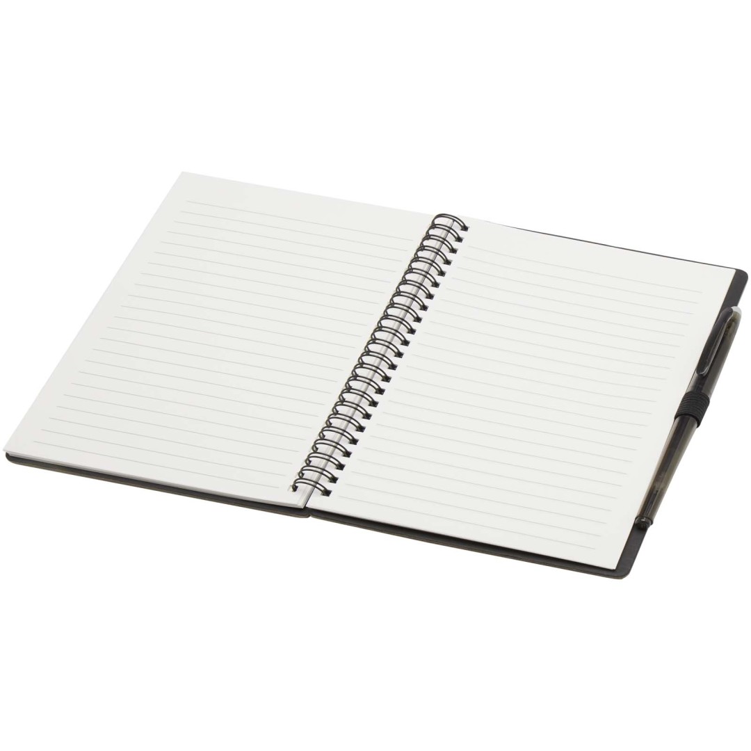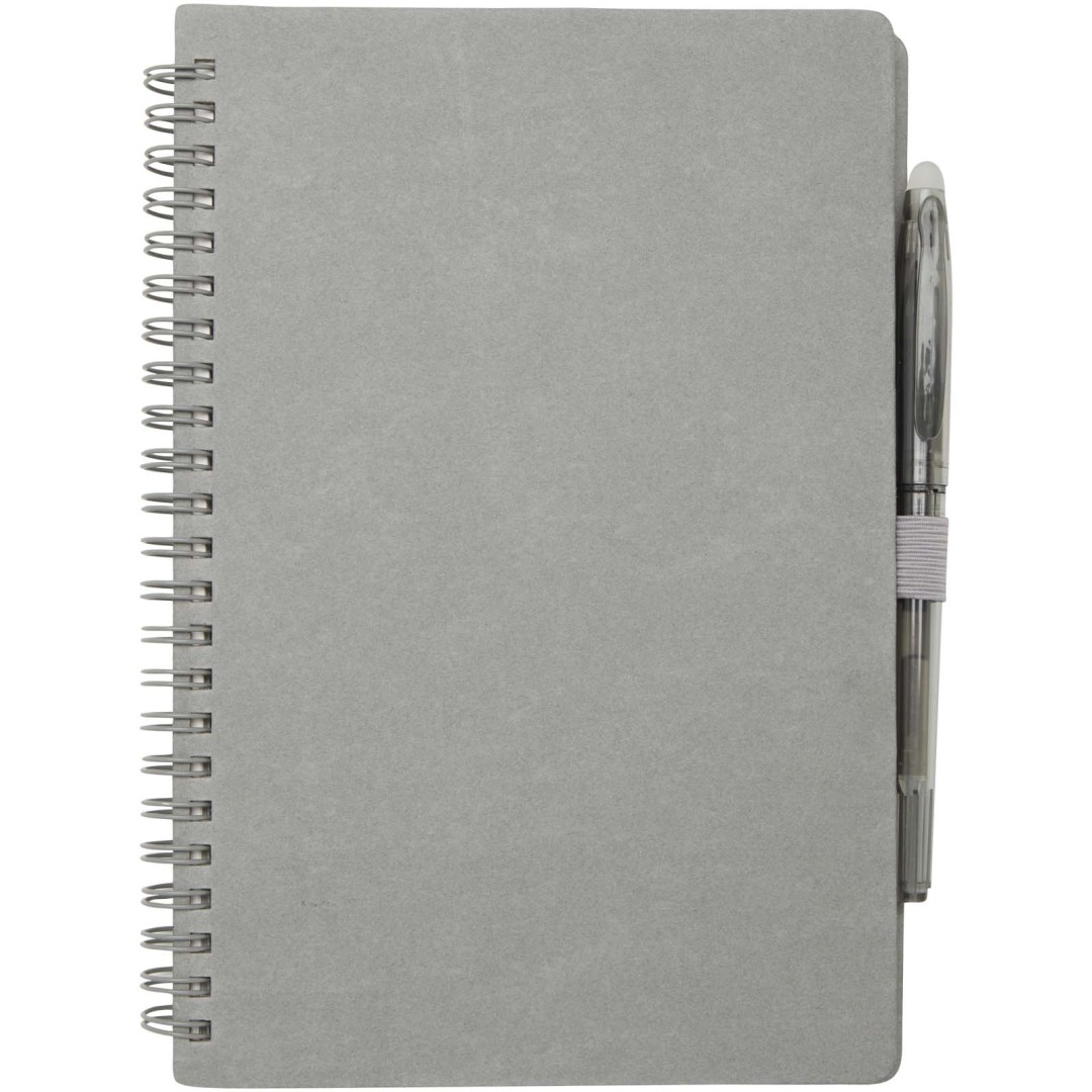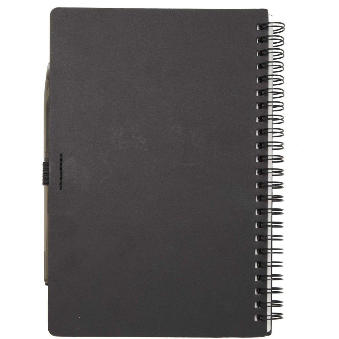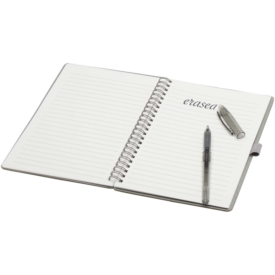 Sada pera a zápisníku z kamenného papíru pro opakované použití. Zápisník má obálku z lepenky, zaoblené rohy a 32 listů linkovaného papíru o gramáži 120 g/m². Kamenný papír je vyroben zcela bez použití stromů a výrobní proces spotřebovává méně energie ve srovnání s recyklovaným nebo novým papírem z celulózy. Na zadní straně je kapsa na černý hadřík (součástí balení). Mazací pero z recyklovaného plastu s průhledným tělem, bílou gumou nahoře a neprůhledným úchopem. Barva inkoustu: Černá. Délka psaní: 250 metrů. Rozměr hrotu: 0,7 mm.