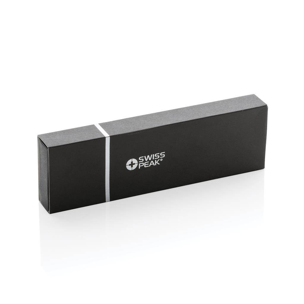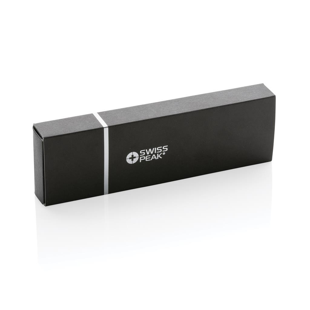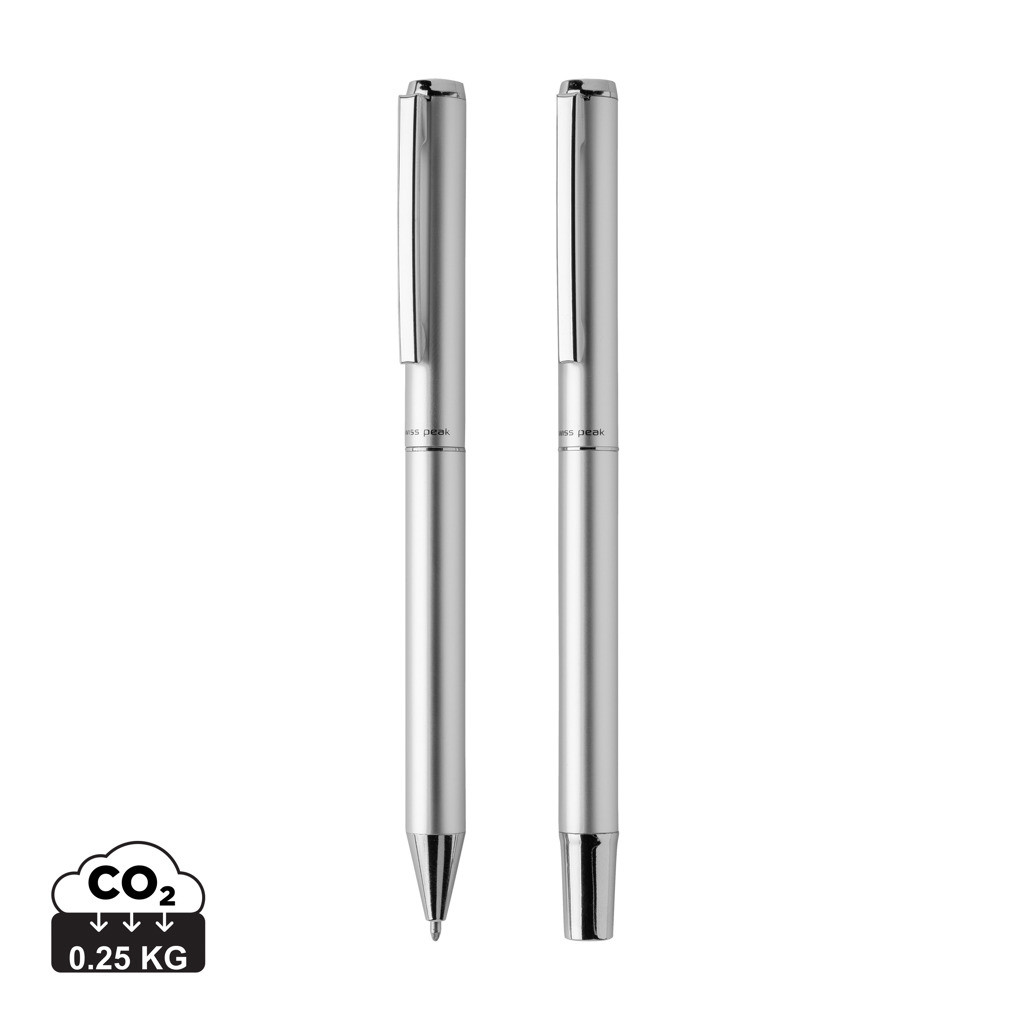 Sada per Cedar z kolekce Swiss Peak je perfektní kombinací moderního a elegantního stylu. Nejen, že skvěle vypadá, zároveň snižuje negativní dopad na životní prostředí. Obsahuje modrou náplň inkoustu Dokumental s garantovanou délkou psaní minimálně 1 200 m v případě kuličkového pera, a 400 m v případě rolleru. Vyrobená z RCS recyklovaného hliníku. RCS (Recycled Claim Standard) je globální standard, který umožňuje ověřit použití recyklovaného materiálu v produktu napříč celým dodavatelským řetězcem. Celkový podíl recyklátu dle váhy produktu: 17 %.