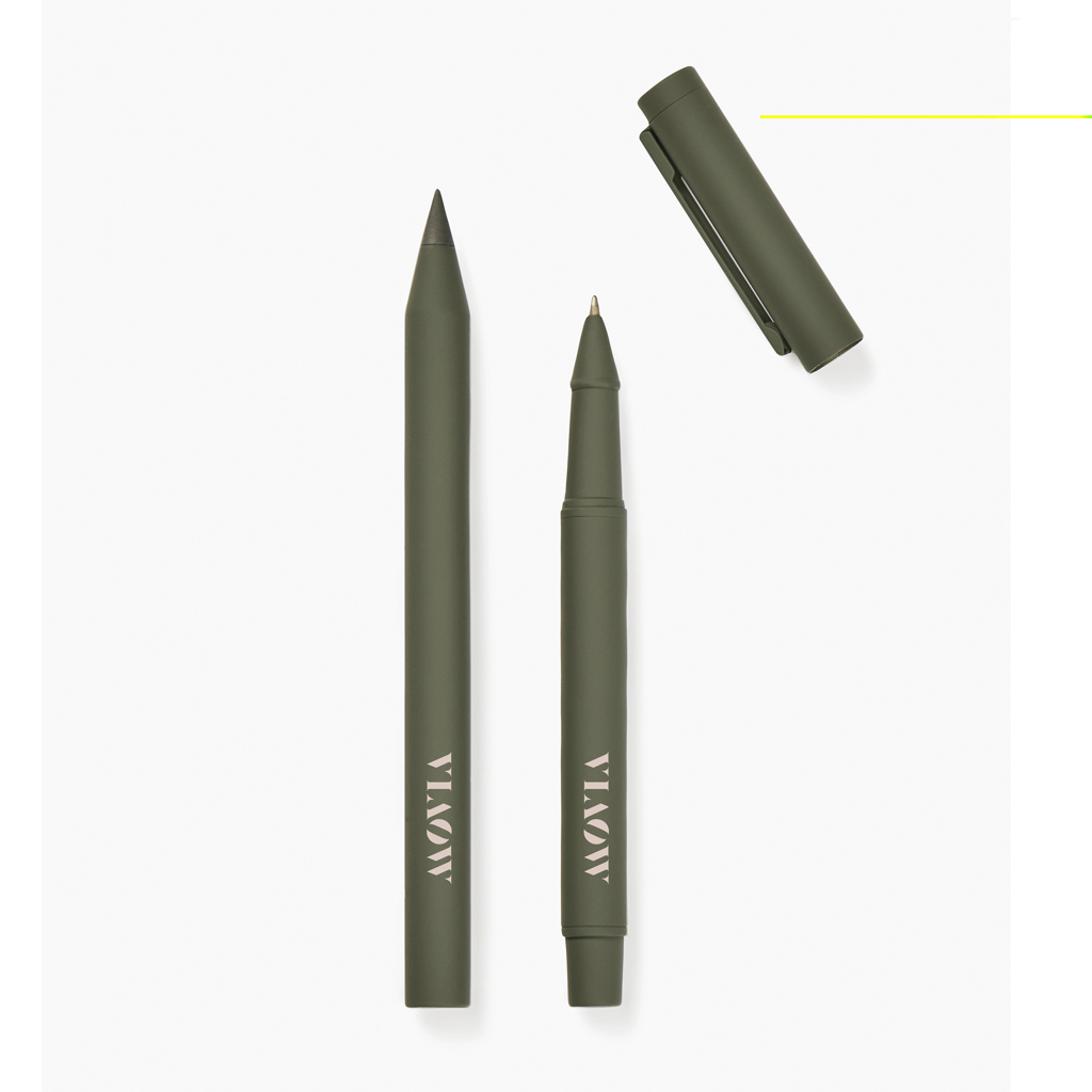 Tato moderní a elegantní sada obsahuje dvě pera: "věčné" pero a klasické kuličkové pero. Pera jsou vyrobena z recyklované nerezové oceli s certifikátem RCS, mají pogumovaný povrch pro pohodlné držení a matný povrch. Obě pera mají vyváženou hmotnost, která zajišťuje stabilitu a psaní bez námahy. "Věčné" pero nabízí neomezené psaní. Kuličkové pero má jemný hrot o průměru 1,00 mm a poskytuje hladké a konzistentní psaní modrým inkoustem, který vydrží až 1 200 metrů. Certifikace RCS zaručuje, že celý dodavatelský řetězec recyklovaných materiálů je certifikován. Celkový obsah recyklovaných materiálů se odvíjí od celkové hmotnosti výrobku. Tento výrobek obsahuje 52 % recyklovaného hliníku s certifikací RCS a 10 % nerezové oceli s certifikací RCS.