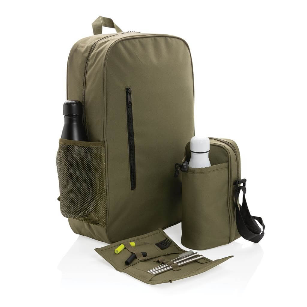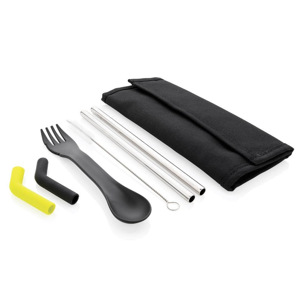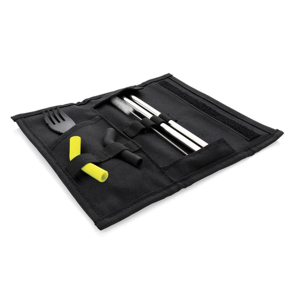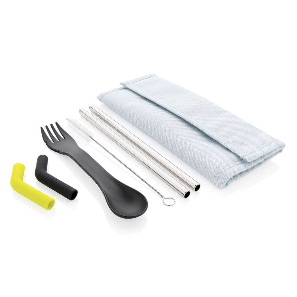 Sada Tierra obsahující 2ks brček z nerezavějící oceli, kartáč na čištění, vidličku a lžičku 2 v 1 a 2 zahnuté silikonové části brčka (ve dvou barvách pro rozeznání) pro pohodlné pití. Balené v praktickém pouzdře s Velcro zapínáním. Ideální pro snižování spotřeby jednorázových plastových produktů. Vhodné do myčky nádobí. Vnější část pouzdra vyrobena z 600D polyesteru, vnitřní část z 210D polyesteru. Bez PVC.