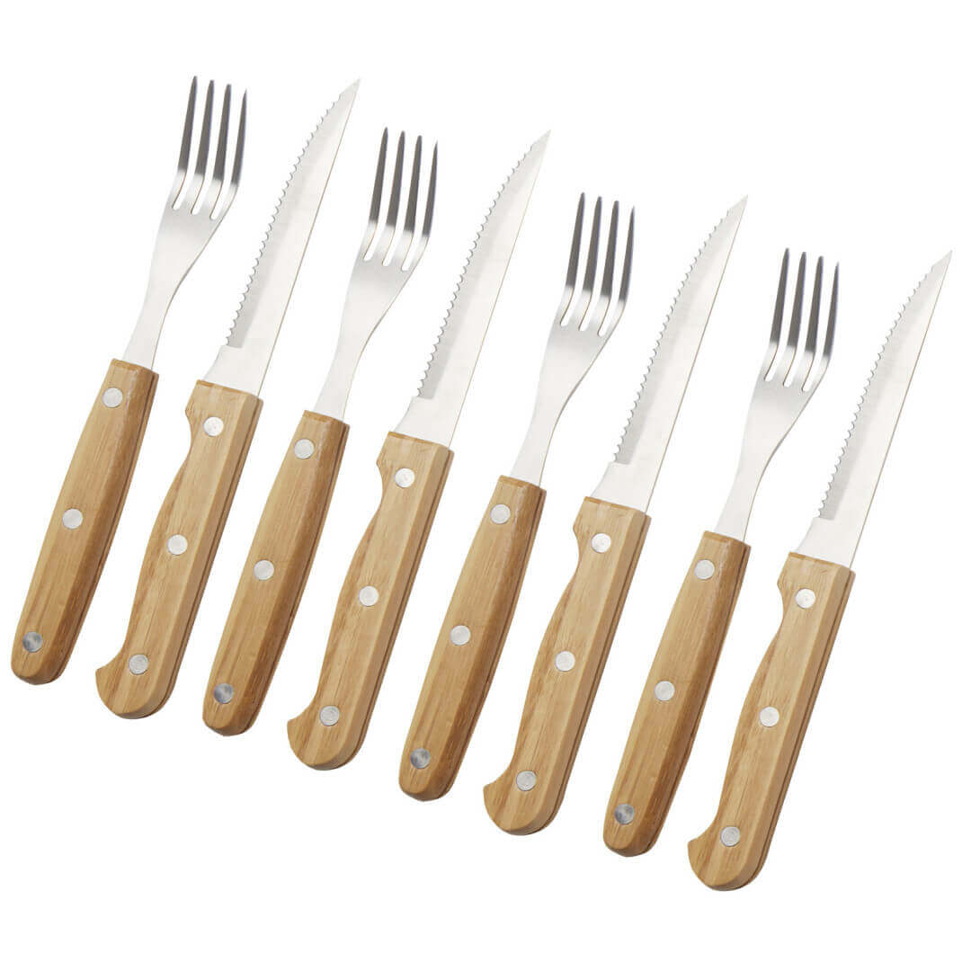 8dílná sada steakových příborů se 4 steakovými noži (21,2 × 2 cm) a 4 steakovými vidličkami (19,8 × 2,1 cm). Nezbytný doplněk víkendových gurmánských večeří pro stylové krájení steaku. Rukojeti jsou vyrobeny z bambusu, který se získává a vyrábí v souladu se zásadami udržitelnosti.