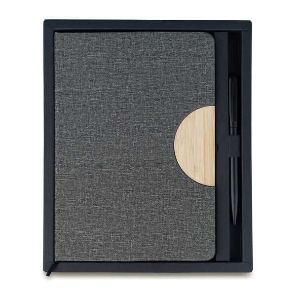 Sada obsahuje zápisník s bambusovým lemem a pero z hliníku s matným povrchem a modrou náplní. Pevnou vazbu zápisníku můžete proměnit ve stojánek na mobil. Zápisník má 160 linkovaných stran (70 g/m2), zavírání na elastickou pásku a stužku pro založení stránek. Baleno v černé dárkové krabičce.