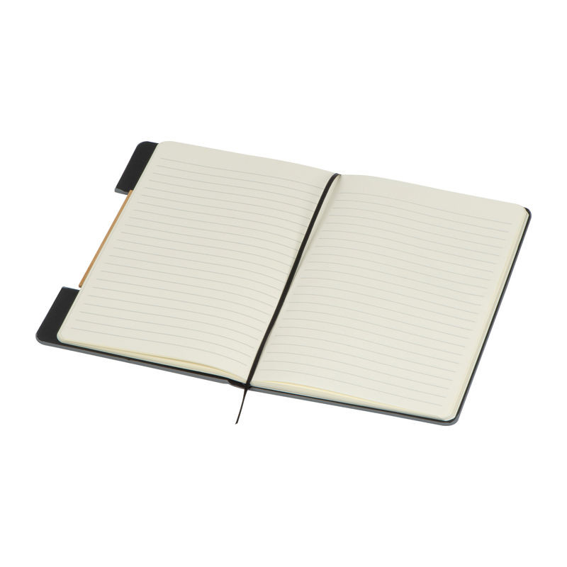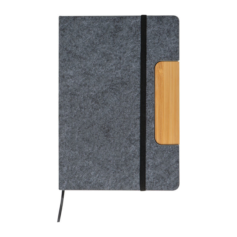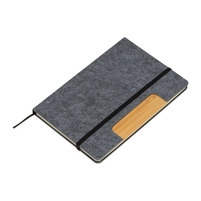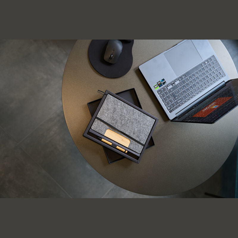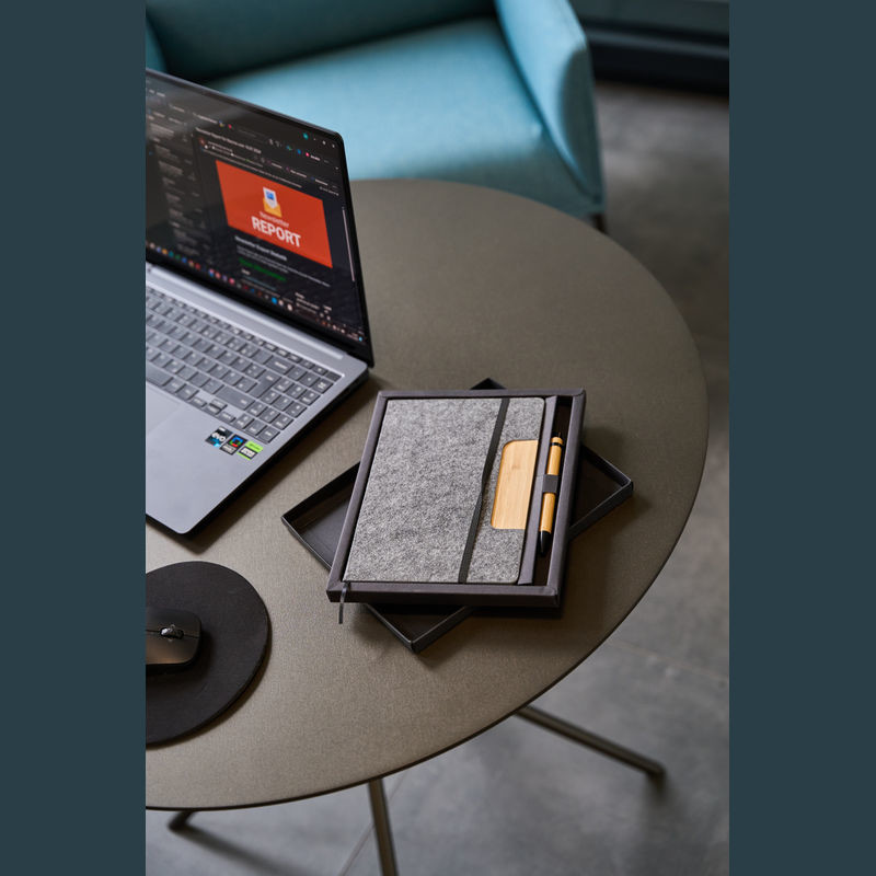 Sada sestávající ze zápisníku s plstěným/bambusovým obalem a bambusového kuličkového pera, zabalená v černé dárkové krabičce. Obsahuje 80 stran linkovaného recyklovaného papíru (70 g/m²), kuličkové pero je vybaveno modrým inkoustem a náhradní náplní.