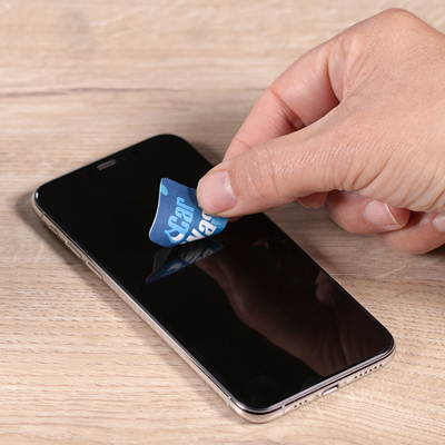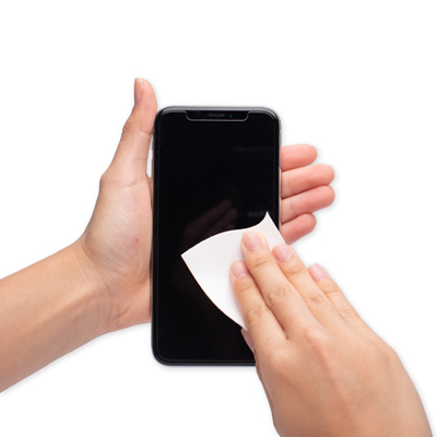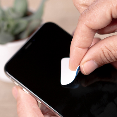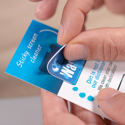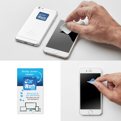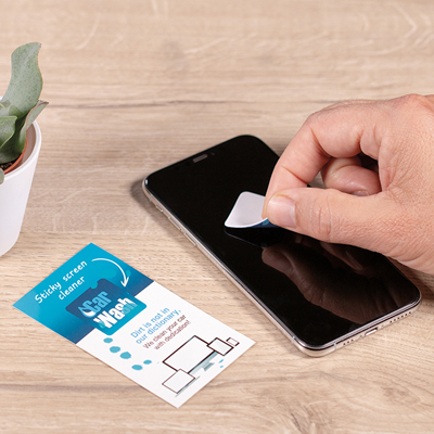 Samolepící čistič Sticky Cleaner na všechny mobilní telefony a tablety, dodávaný na potištěné kartě (100x57mm, 300 g/m2). Vrchní vrstva Sticky Cleaneru je vyrobena z plnobarevné čistící utěrky z mikrovlákna. Každá položka je zabalena v sáčku. Možnost vyrobit vlastní tvar za příplatek.