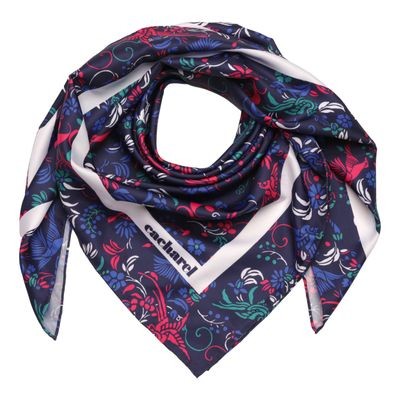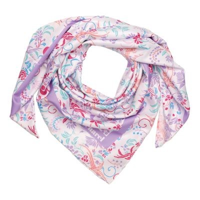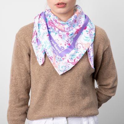 Šátek "Alma" je potlačen svěžími a romantickými květy a ptáky inspirovanými svobodou, s jasnými a poetickými tóny. Tento šátek je vyroben z veganského hedvábí (polyesterový kepr). Jeho velikost 90 X 90 cm z něj činí velmi všestranný doplněk, který lze nosit na stovky různých způsobů.