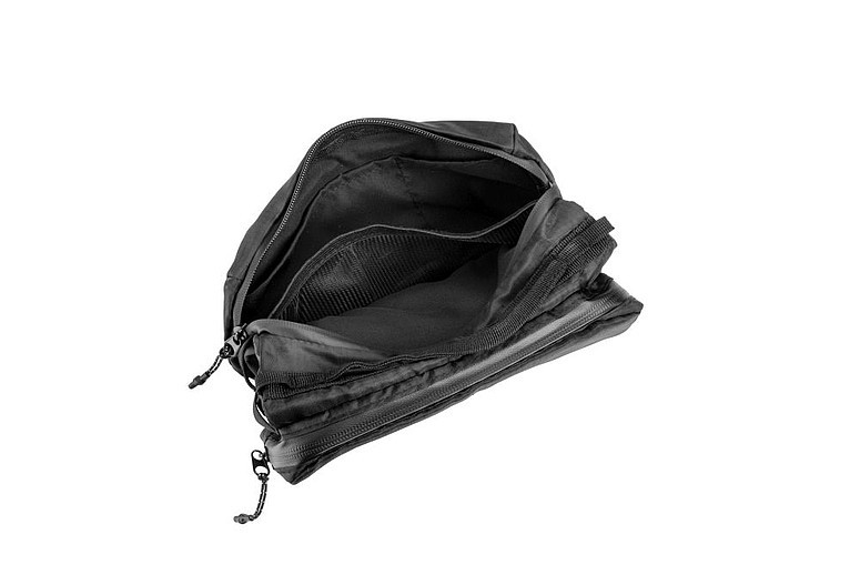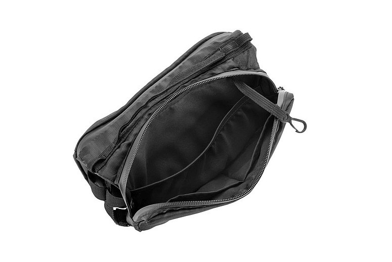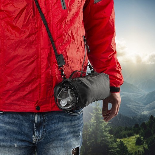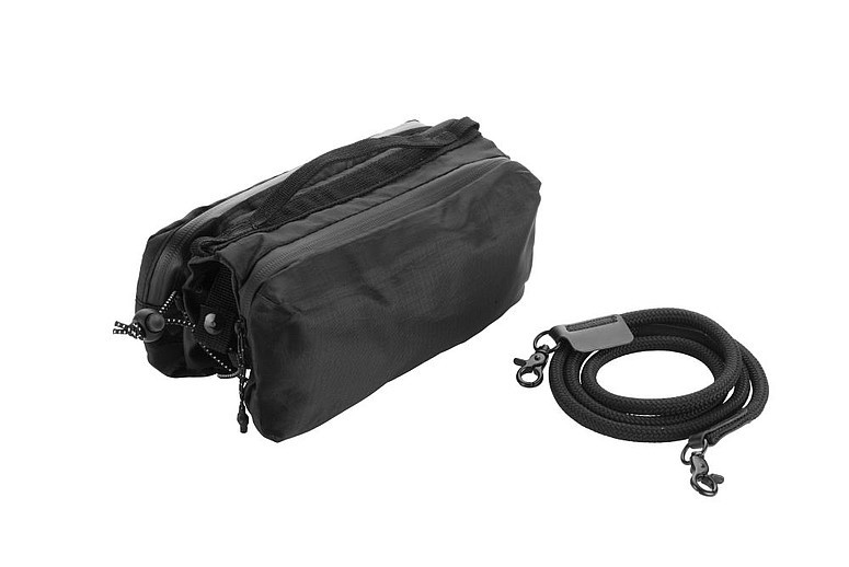 Příruční taška přes rameno značky Schwarzwolf s prostorem na láhev s pitím nebo deštník. Taštička obsahuje dvě hlavní kapsy na zip. V jedné kapse se nachází dvě kapsičky na kreditní karty a jedna síťovaná kapsička, ve druhé kapse dvě kapsičky na sluchátka a další drobnosti a jedna kapsa s karabinkou. Středová oblast mezi hlavními kapsami obsahuje pevnou gumu, do které lze umístit láhev s pitím nebo deštník. Šňůrku od tašky lze použít také jako šňůrku na telefon. Baleno v papírovém rukávu.