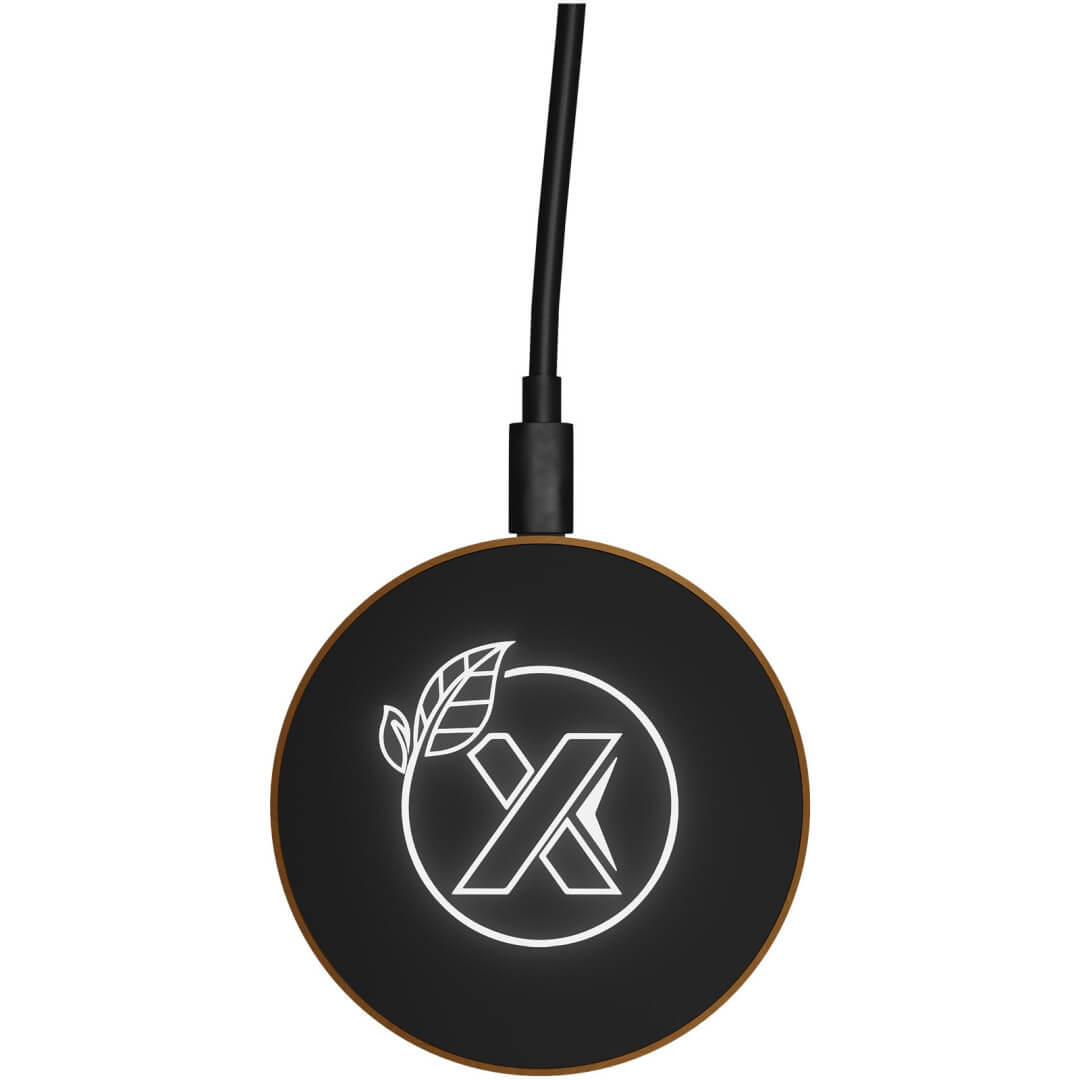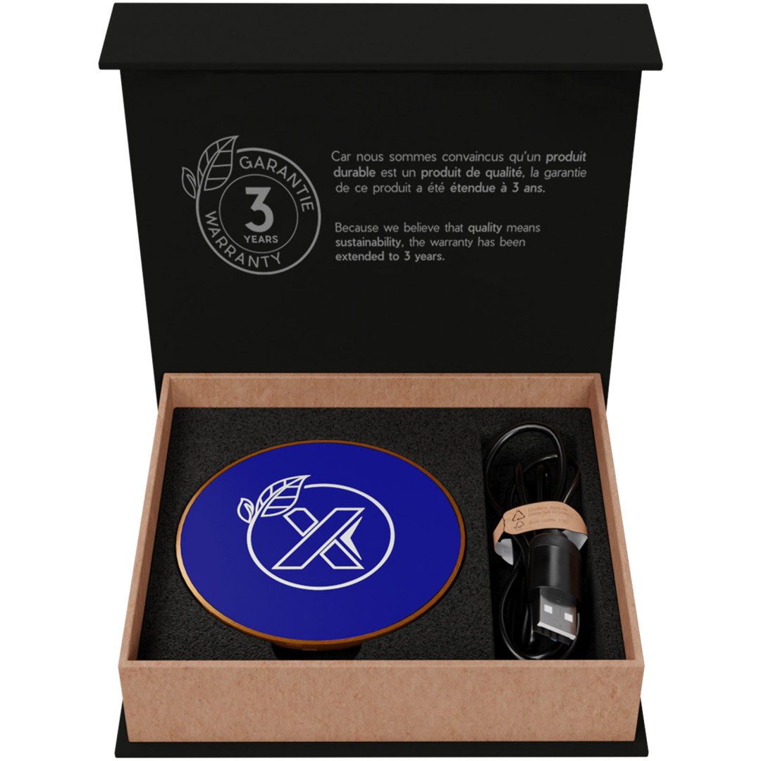 10W bezdrátová nabíjecí stanice z gumy a dřeva a nabíjecí kabel z recyklovaného PET plastu. Může být vyzdobeno svítícím logem. Dodává se v černé lepenkové dárkové krabičce s magnetickým uzávěrem. Patent EUROPE EUIPO.