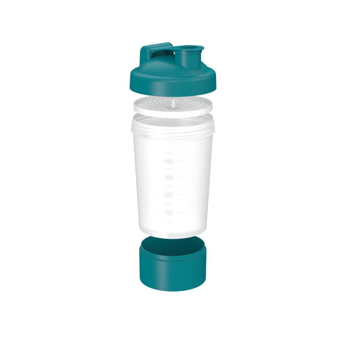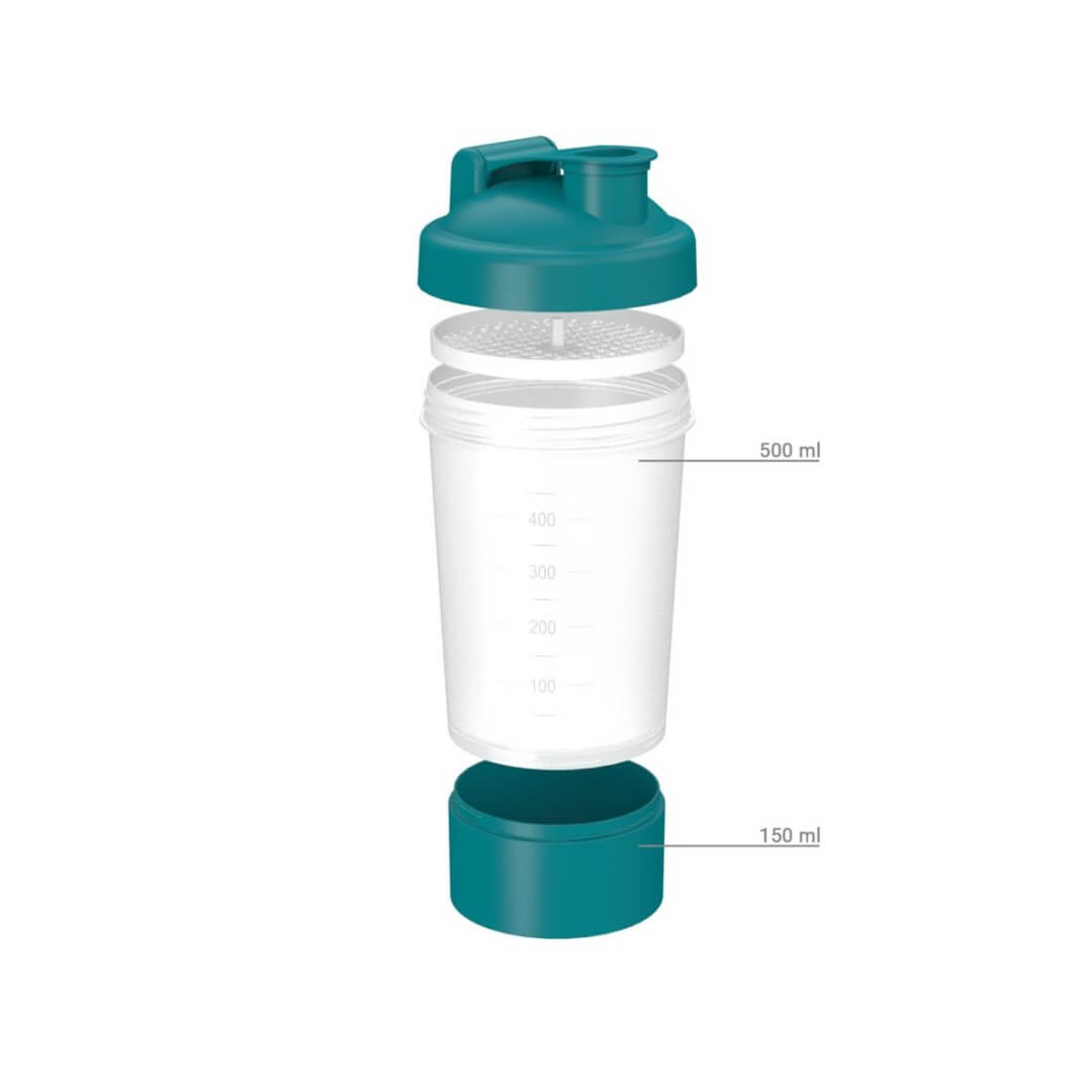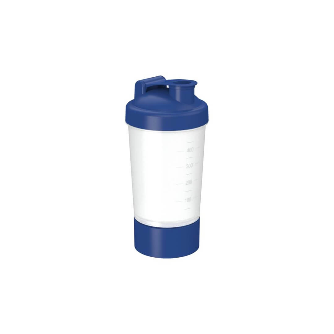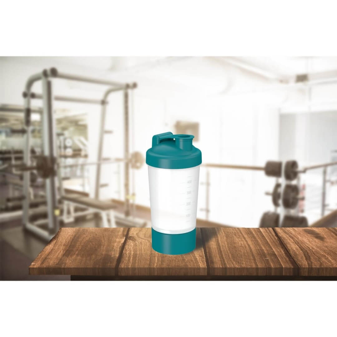 Ideální pro proteinový koktejl po tréninku. Součástí tohoto šejkru s vyraženou stupnicí v 50ml krocích a šroubovacím uzávěrem s uzavíratelným otvorem na pití je vyjímatelné sítko, se kterým se šejkrový prášek a tekutina při dobrém protřepání optimálně promísí. Navíc má tento šejkr vyjímatelnou komoru, kterou lze plnit samostatně. Mixovací nádobu lze zcela demontovat, a proto se snadno čistí. Kapacita: 0,4 litru.
