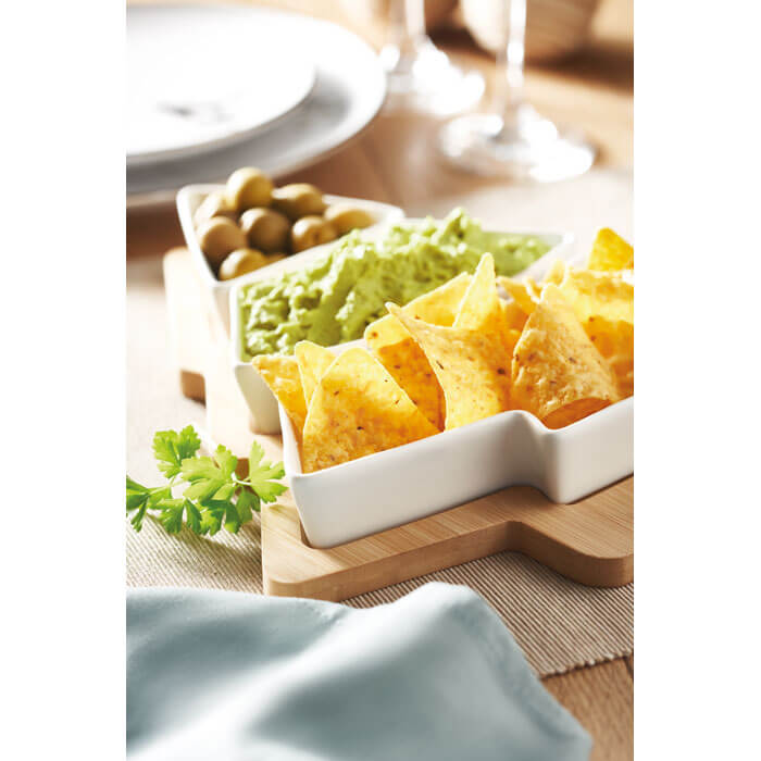 Bambusový servírovací podnos ve tvaru stromečku a třemi keramickými servírovacími miskami. Na tomto přírodním servírovacím prkénku můžete servírovat občerstvení, sýry a další chutné pokrmy. Podnos a keramické misky můžete prezentovat jako celek nebo je oddělit a servírovat tak více druhů jídla. Bambus je přírodní materiál, může dojít k mírným změnám barvy, dekorace a velikosti.